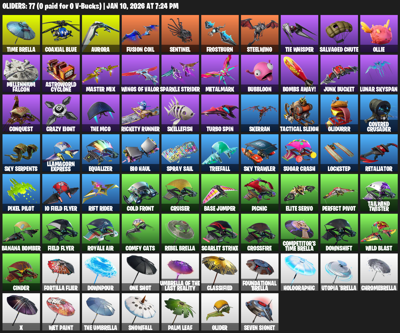 Time Brella, Aurora, Sentinel, Frostburn, Steelwing, TIE Whisper, Salvaged Chute, Ollie, Millennium Falcon, Astroworld Cyclone, Master Mix, Wings of Valor, Sparkle Strider, Metalmark, Bubbloon, Bombs Away!, Junk Bucket, Lunar Skyspan