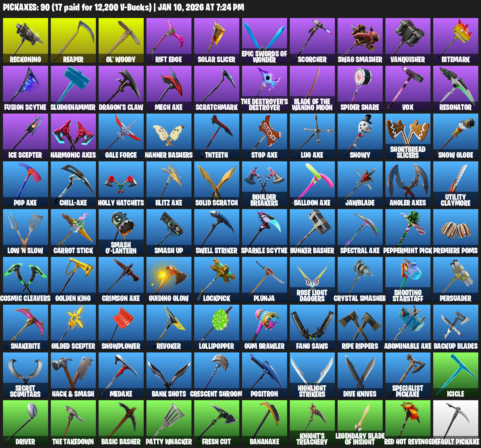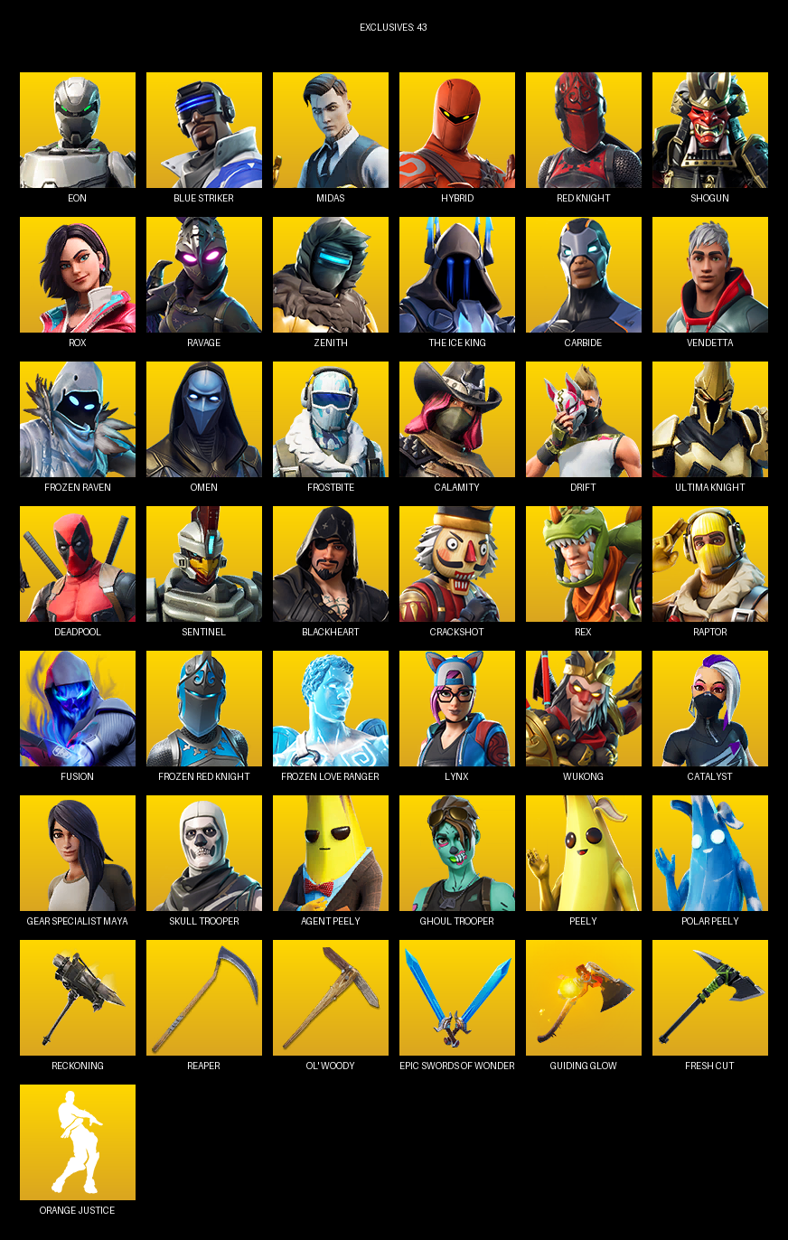 Reckoning, Reaper, Ol’ Woody, Rift Edge, Solar Slicer, Scorcher, Swag Smasher, Vanquisher, Bitemark, Fusion Scythe, Sludgehammer, Dragon’s Claw, Mech Axe, Scratchmark, Spider Snare, Vox, Resonator