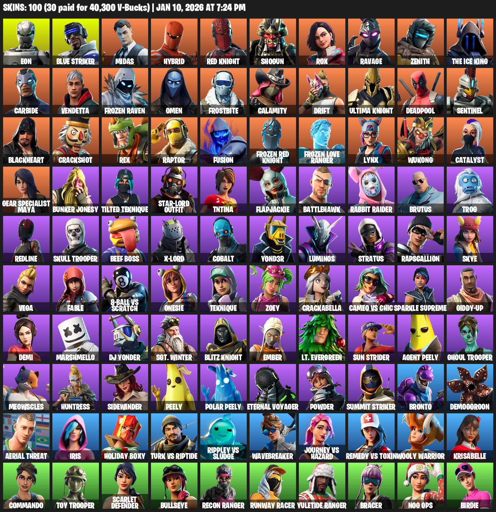 Gear Specialist Maya, Eon, Blue Striker, Midas, Hybrid, Red Knight, Shogun, Rox, Ravage, Zenith, The Ice King, Carbide, Vendetta, Frozen Raven, Omen, Frostbite, Calamity, Drift, Deadpool