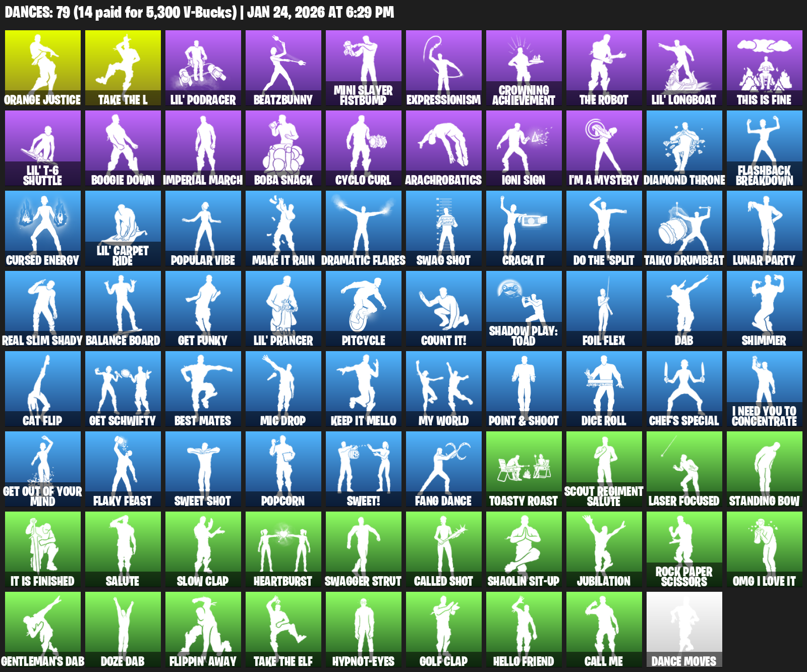 Orange Justice, Lil’ Podracer, BeatzBunny, Mini Slayer Fistbump, Expressionism, Crowning Achievement, This is Fine, Boogie Down, Imperial March, Boba Snack, Cyclo Curl, Arachrobatics, Igni Sign, I’m a Mystery, Flashback Breakdown