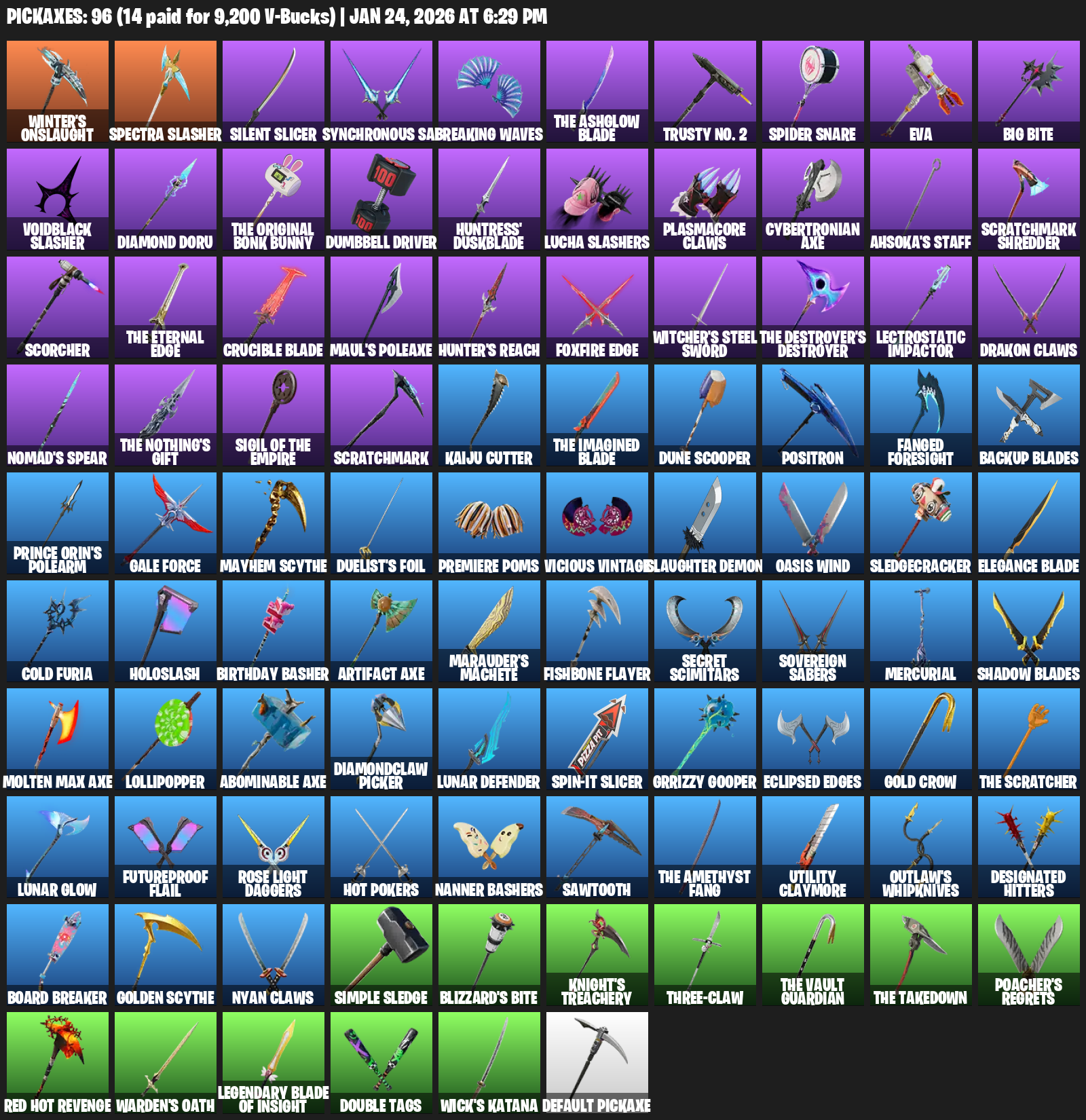 Winter’s Onslaught, Silent Slicer, Synchronous Sai, Breaking Waves, Trusty No. 2, Spider Snare, EVA, Big Bite, Voidblack Slasher, Diamond Doru, Dumbbell Driver, Huntress’ Duskblade, Lucha Slashers, Plasmacore Claws, Cybertronian Axe, Ahsoka’s Staff, Scratchmark Shredder