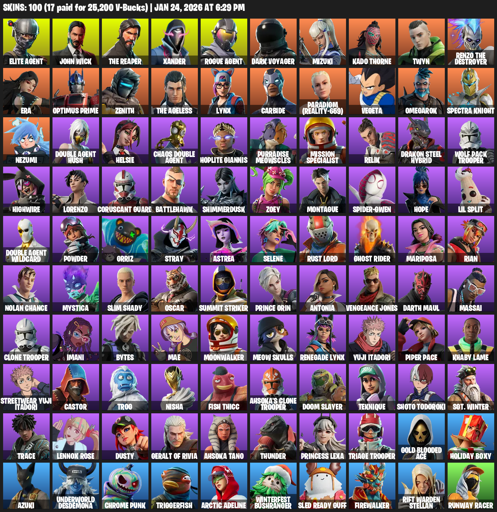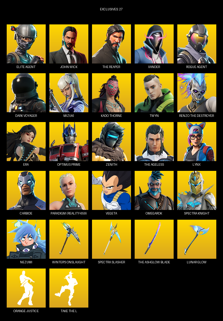 Elite Agent, The Reaper, John Wick, Xander, Dark Voyager, Mizuki, Kado Thorne, Twyn, Era, Optimus Prime, Zenith, Lynx, Carbide, Paradigm (Reality-659), Vegeta, Omegarok, Spectra Knight