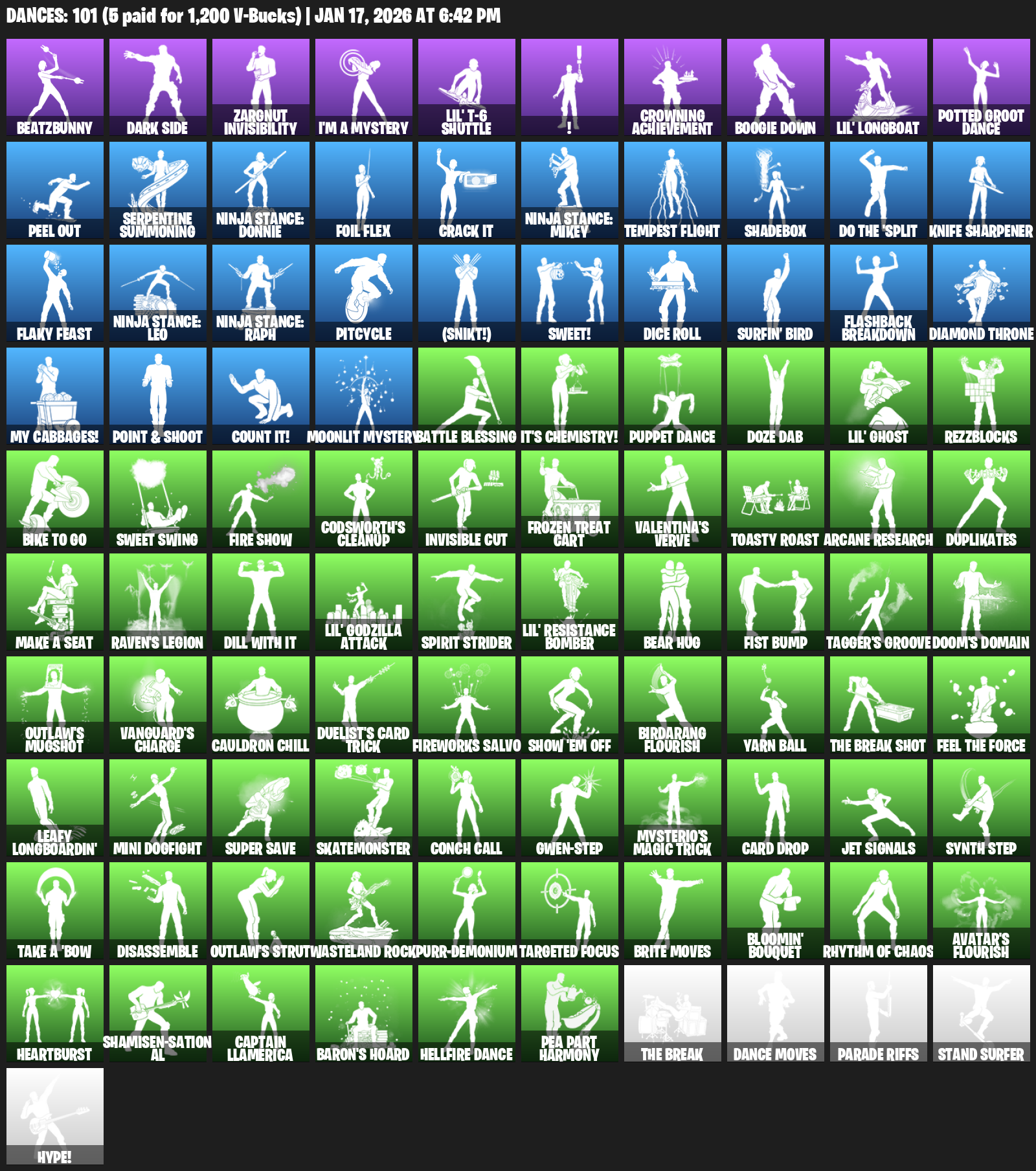BeatzBunny, Dark Side, Zargnut Invisibility, I’m a Mystery, Lil’ T-6 Shuttle, !, Crowning Achievement, Boogie Down, Potted Groot Dance, Peel Out, Serpentine Summoning, Ninja Stance: Donnie, Foil Flex, Crack It, Tempest Flight, Shadebox