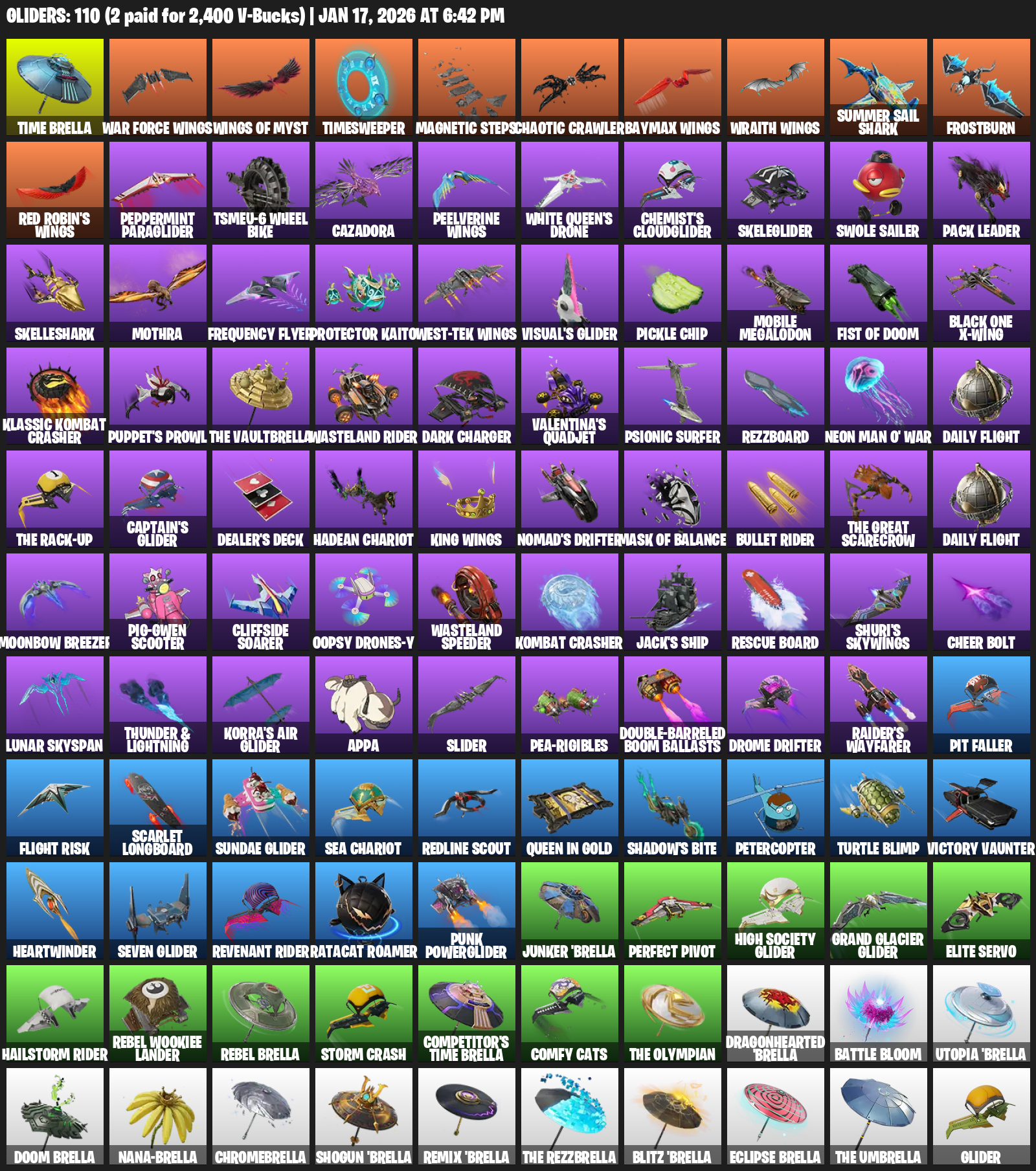 Time Brella, War Force Wings, Timesweeper, Magnetic Steps, Chaotic Crawler, Summer Sail Shark, Frostburn, Peppermint Paraglider, Cazadora, White Queen’s Drone, Chemist’s Cloudglider, Skeleglider, Swole Sailer, Pack Leader