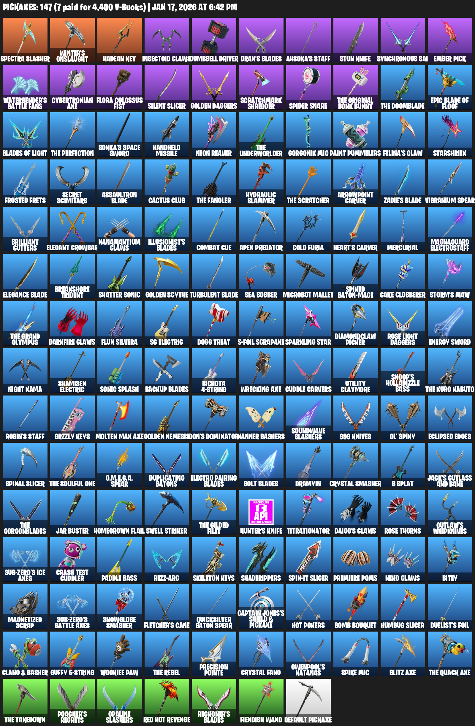 Winter’s Onslaught, Hadean Key, Insectoid Claws, Dumbbell Driver, Drax’s Blades, Ahsoka’s Staff, Stun Knife, Synchronous Sai, Ember Pick, Waterbender’s Battle Fans, Cybertronian Axe, Flora Colossus Fist, Silent Slicer, Golden Daggers, Scratchmark Shredder, Spider Snare, The Original Bonk Bunny