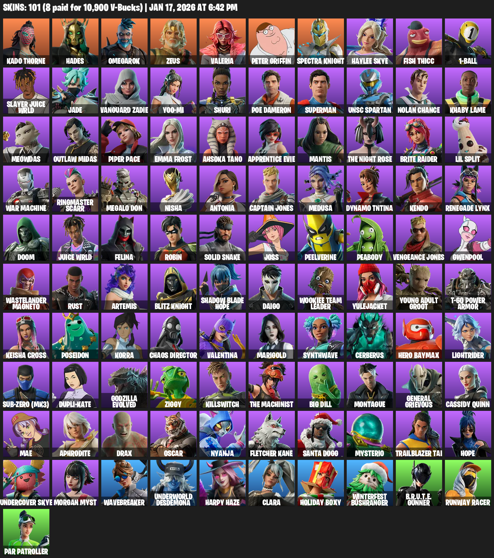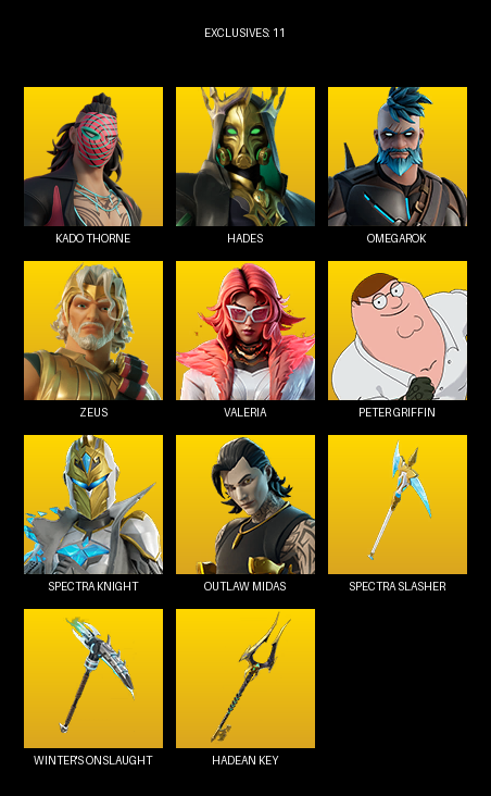 Kado Thorne, Hades, Omegarok, Zeus, Valeria, Peter Griffin, Spectra Knight, Haylee Skye, Fish Thicc, 1-Ball, Slayer Juice WRLD, Jade, Vanguard Zadie, Yoo-mi, Shuri, Poe Dameron, Superman, UNSC Spartan, Nolan Chance, Khaby Lame