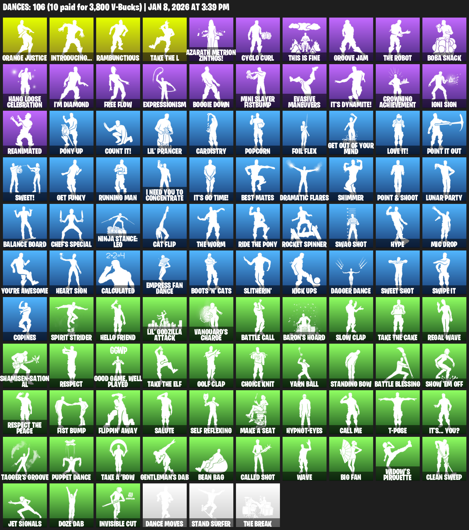 Introducing…, Orange Justice, Rambunctious, Azarath Metrion Zinthos!, Cyclo Curl, This is Fine, Groove Jam, Boba Snack, Hang Loose Celebration, I’m Diamond, Free Flow, Expressionism, Boogie Down, Mini Slayer Fistbump, Evasive Maneuvers, It’s Dynamite!, Crowning Achievement, Igni Sign
