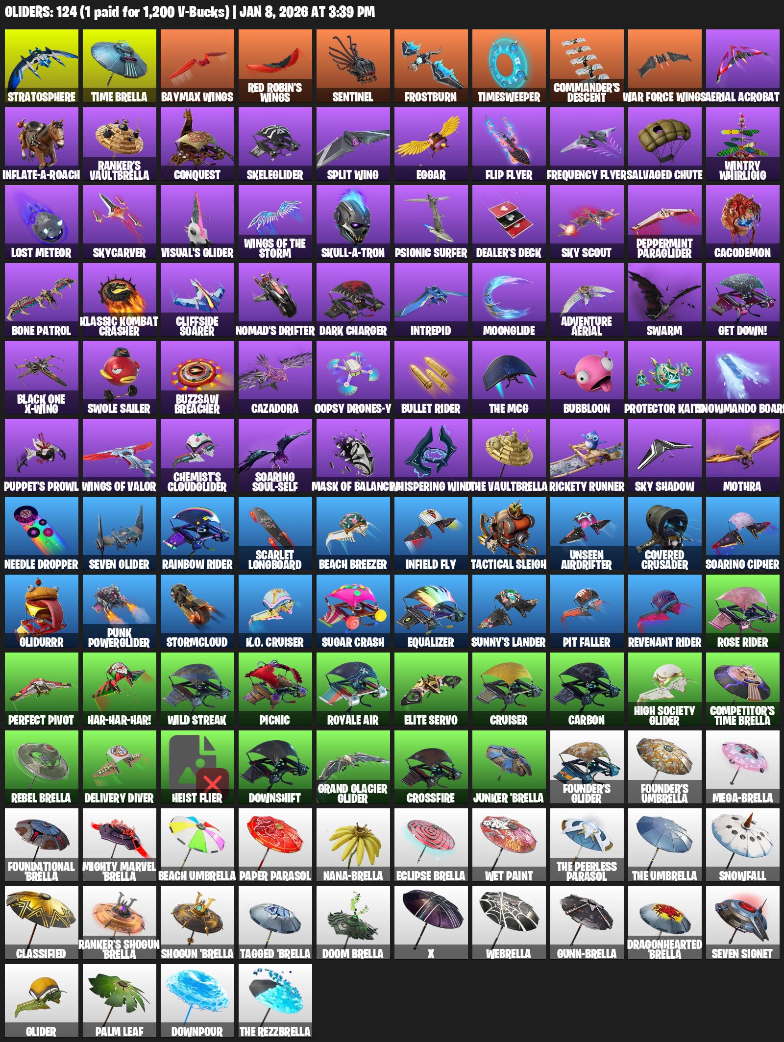 Stratosphere, Time Brella, Baymax Wings, Sentinel, Frostburn, Timesweeper, Commander’s Descent, Aerial Acrobat, Inflate-A-Roach, Ranker’s Vaultbrella, Conquest, Skeleglider, Split Wing, Eggar, Flip Flyer, Salvaged Chute, Wintry Whirligig