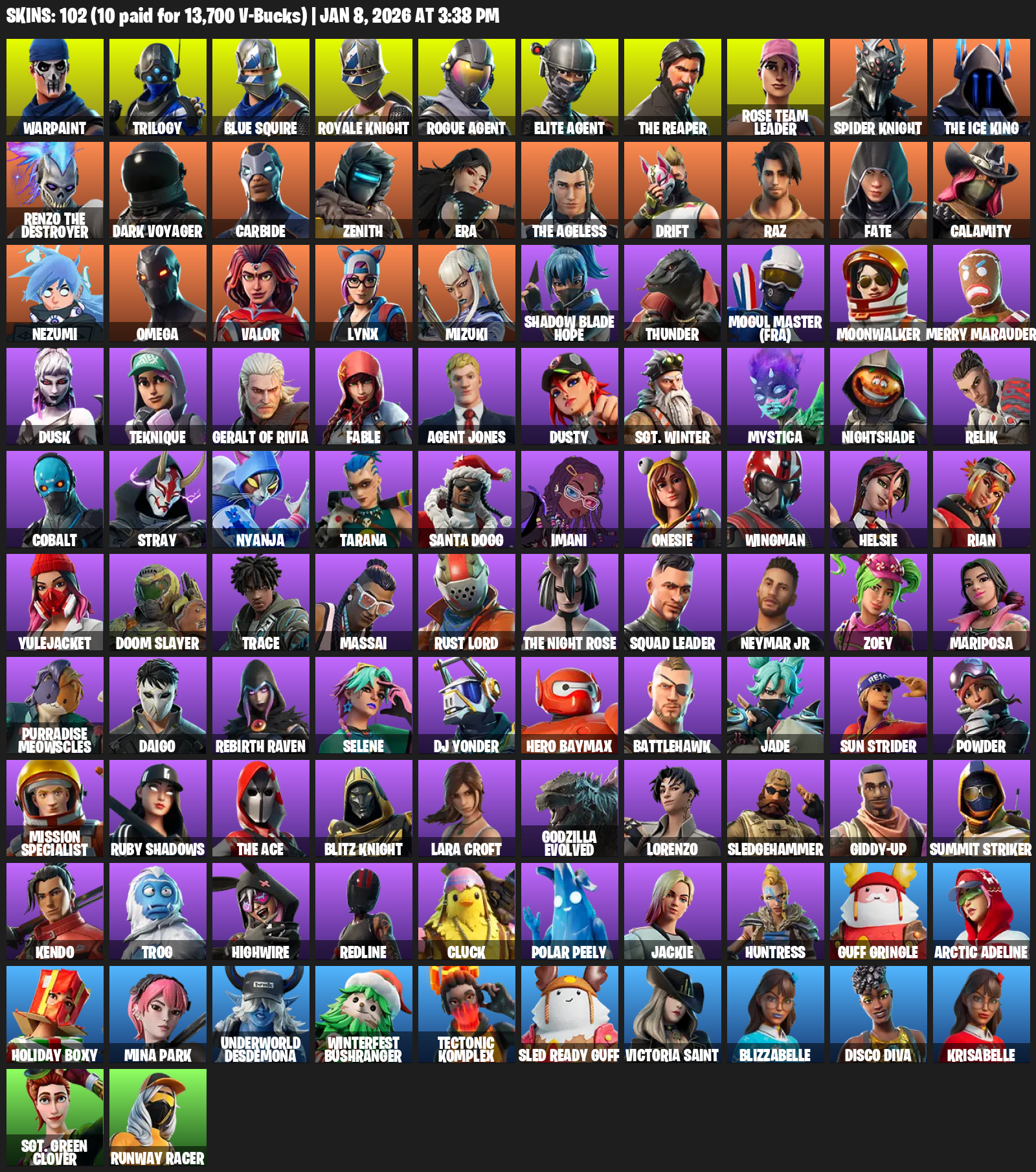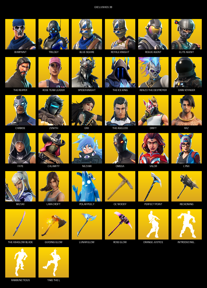 Blue Squire, Royale Knight, Elite Agent, The Reaper, Omega, Lara Croft, Warpaint, Trilogy, Rose Team Leader, Dark Voyager, Carbide, Zenith, Era, Drift, Raz