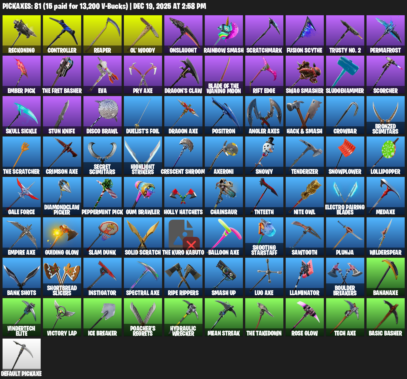 Reckoning, Controller, Ol’ Woody, Onslaught, Rainbow Smash, Scratchmark, Fusion Scythe, Trusty No. 2, Permafrost, Ember Pick, EVA, Pry Axe, Dragon’s Claw, Rift Edge, Swag Smasher, Sludgehammer, Scorcher