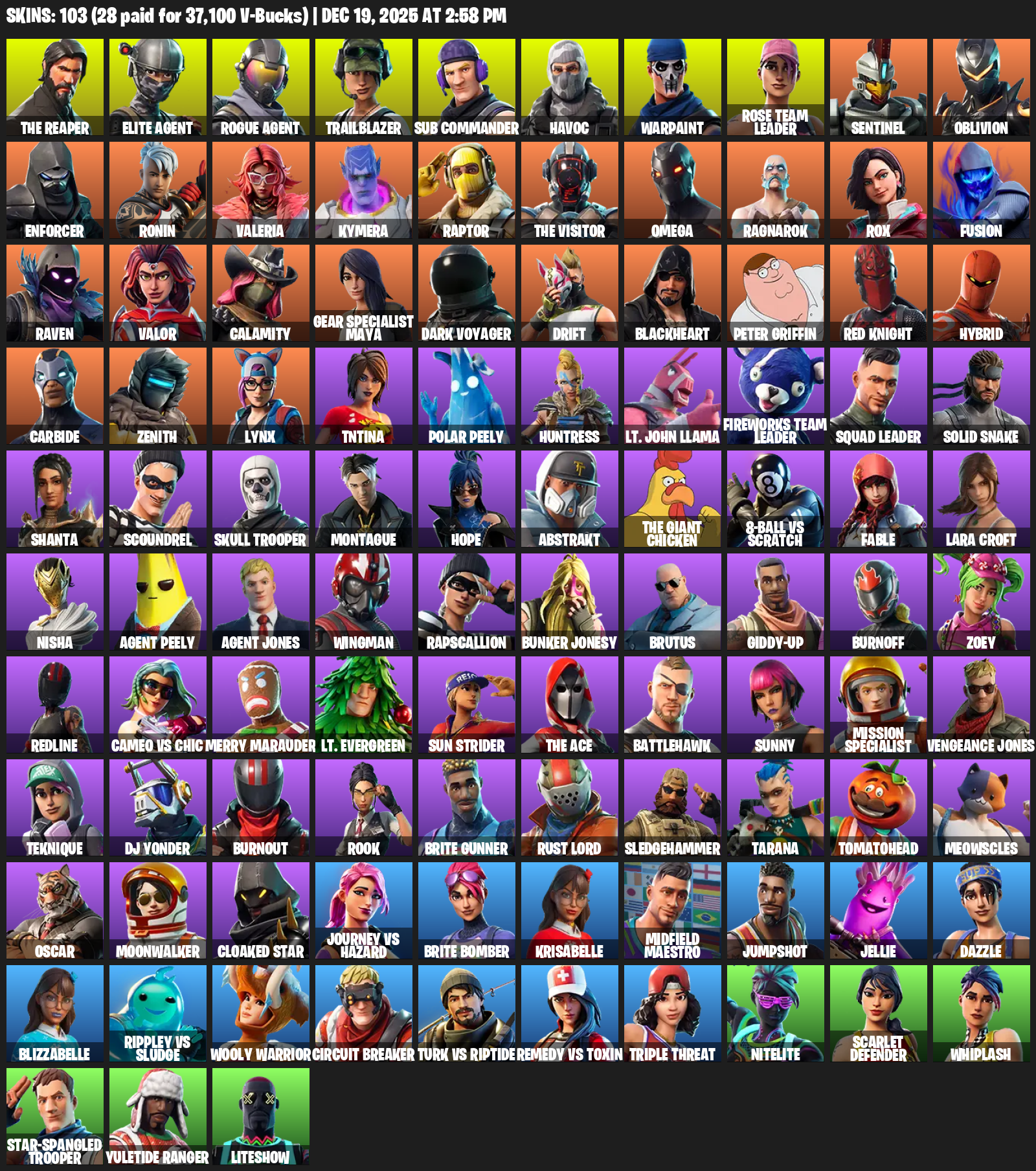 The Reaper, Elite Agent, Omega, Gear Specialist Maya, Lara Croft, Trailblazer, Sub Commander, Havoc, Warpaint, Rose Team Leader, Sentinel, Oblivion, Enforcer, Ronin, Valeria, Kymera, Raptor, Ragnarok