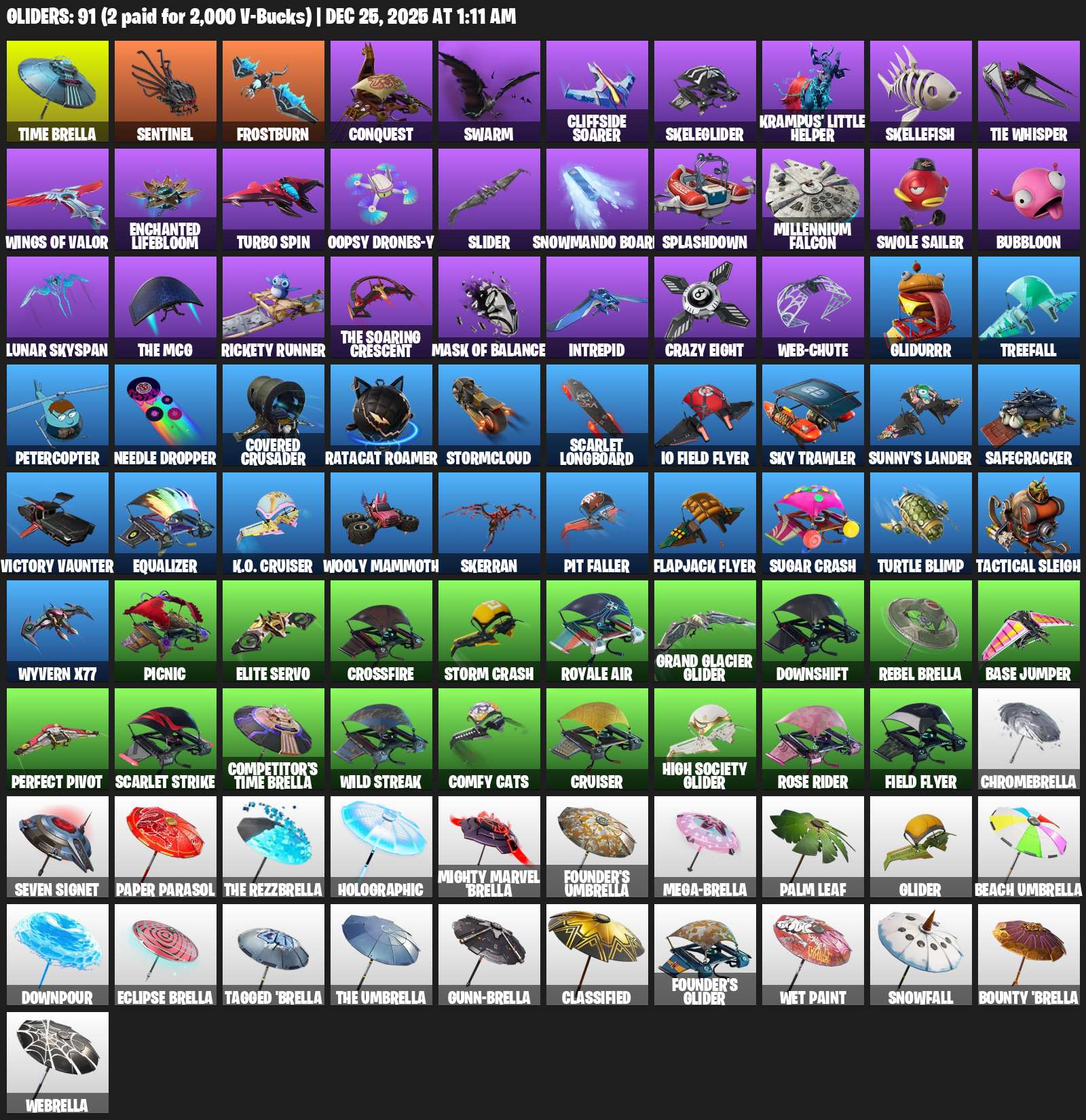 Time Brella, Frostburn, Conquest, Swarm, Cliffside Soarer, Skeleglider, Krampus’ Little Helper, Skellefish, TIE Whisper, Enchanted Lifebloom, Turbo Spin, Oopsy Drones-y, Slider, Snowmando Board, Splashdown, Millennium Falcon, Swole Sailer, Bubbloon