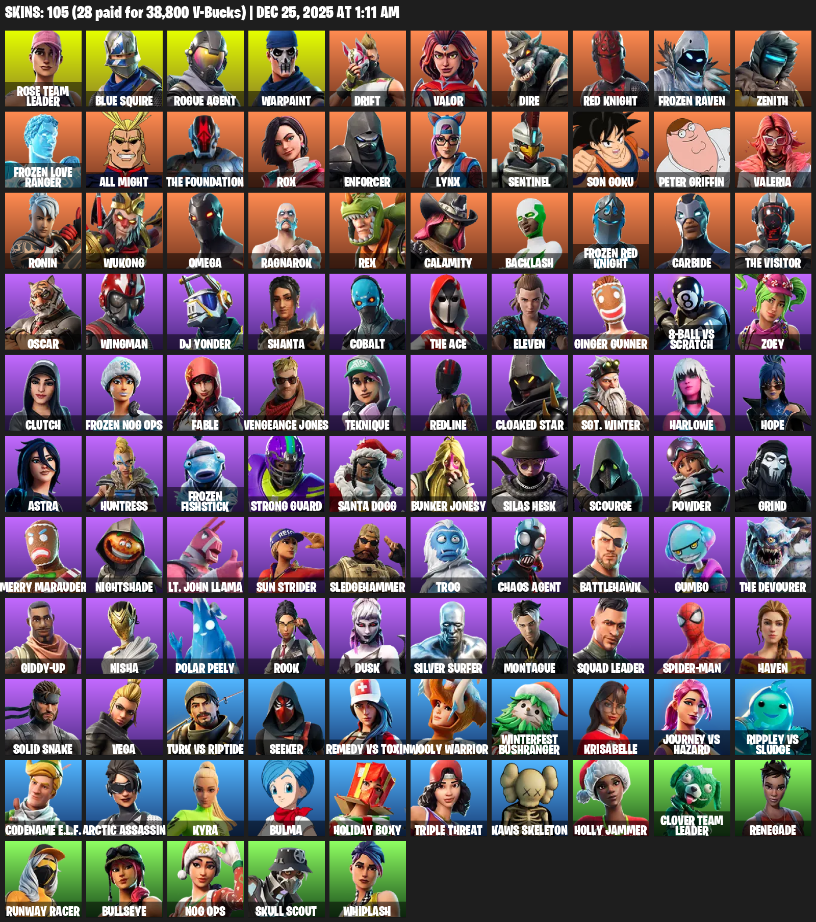 Blue Squire, Omega, Rose Team Leader, Rogue Agent, Warpaint, Drift, Valor, Dire, Red Knight, Frozen Raven, Zenith, All Might, The Foundation, Rox, Enforcer, Lynx, Sentinel, Son Goku, Peter Griffin