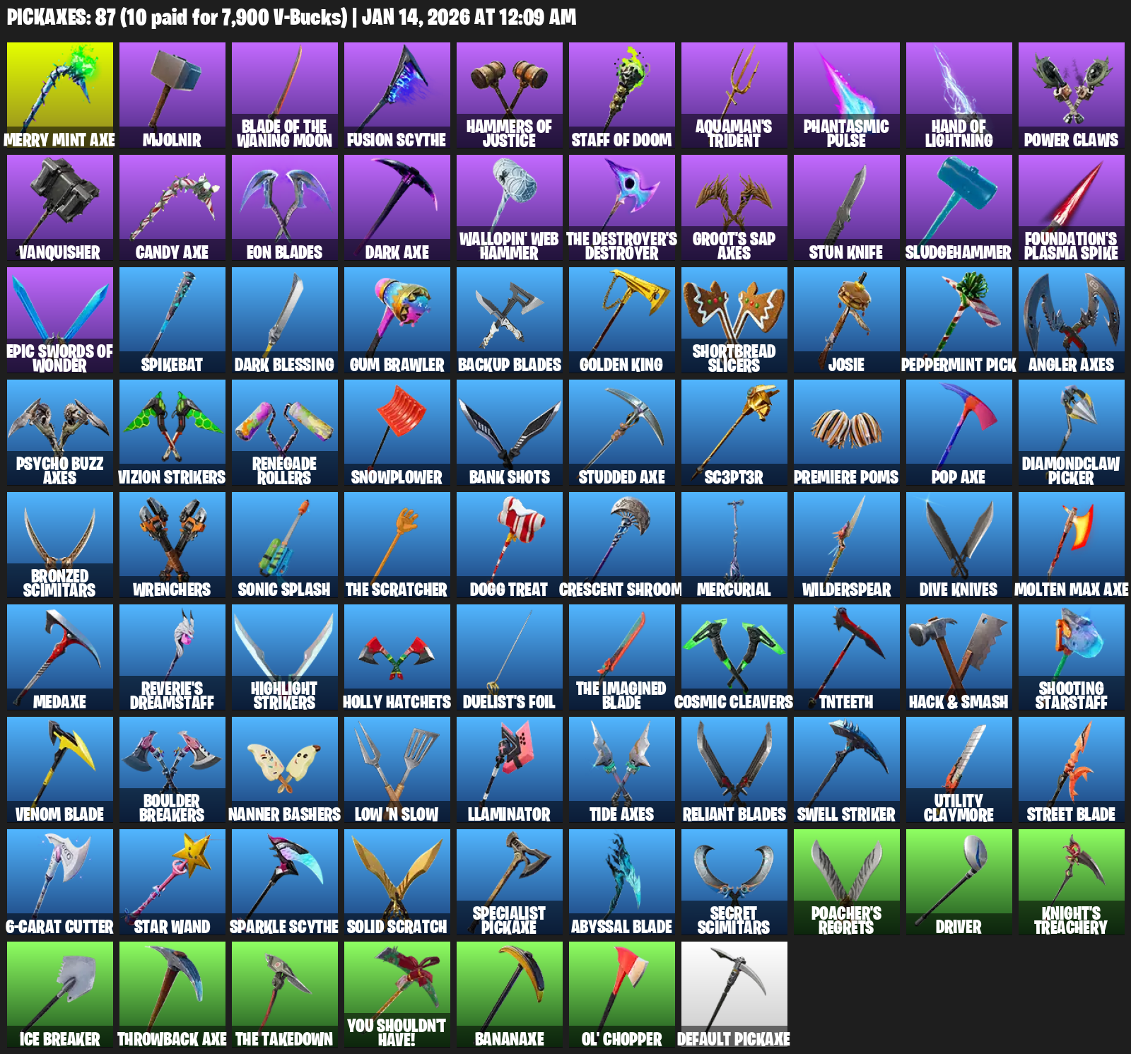 Merry Mint Axe, Mjolnir, Hammers of Justice, Aquaman’s Trident, Phantasmic Pulse, Power Claws, Vanquisher, Eon Blades, Wallopin’ Web Hammer, Groot’s Sap Axes, Stun Knife, Sludgehammer, Foundation’s Plasma Spike