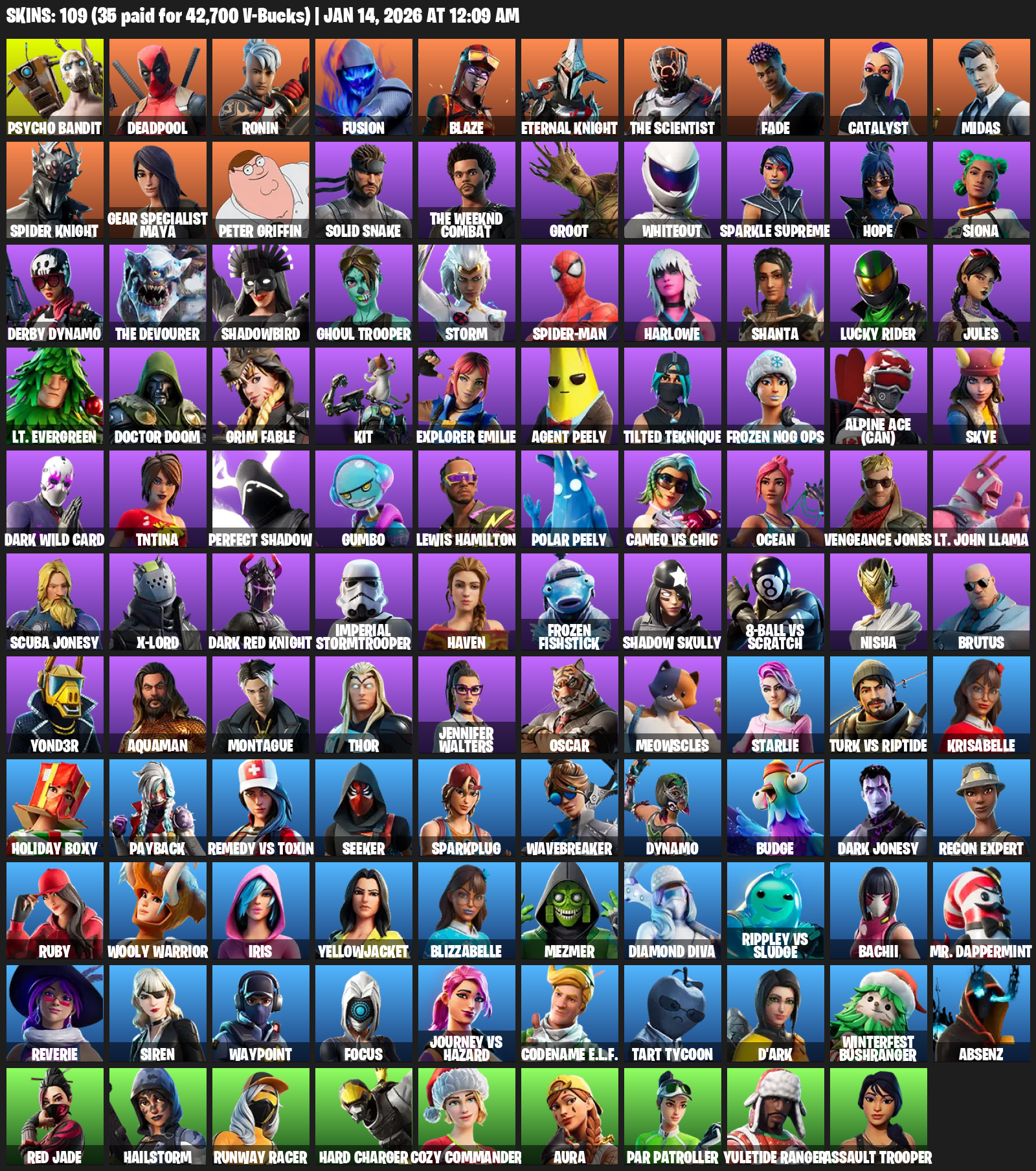 Gear Specialist Maya, Psycho Bandit, Deadpool, Ronin, Fusion, Blaze, Eternal Knight, The Scientist, Fade, Catalyst, Midas, Peter Griffin, Solid Snake, Groot, Whiteout, Sparkle Supreme, Hope, Siona