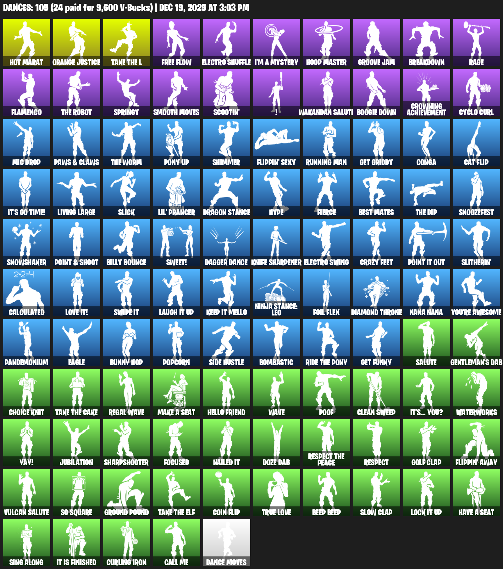 Hot Marat, Orange Justice, Free Flow, Electro Shuffle, I’m a Mystery, Hoop Master, Groove Jam, Breakdown, Rage, Flamenco, Springy, Smooth Moves, Scootin’, !, Wakandan Salute, Boogie Down, Crowning Achievement, Cyclo Curl