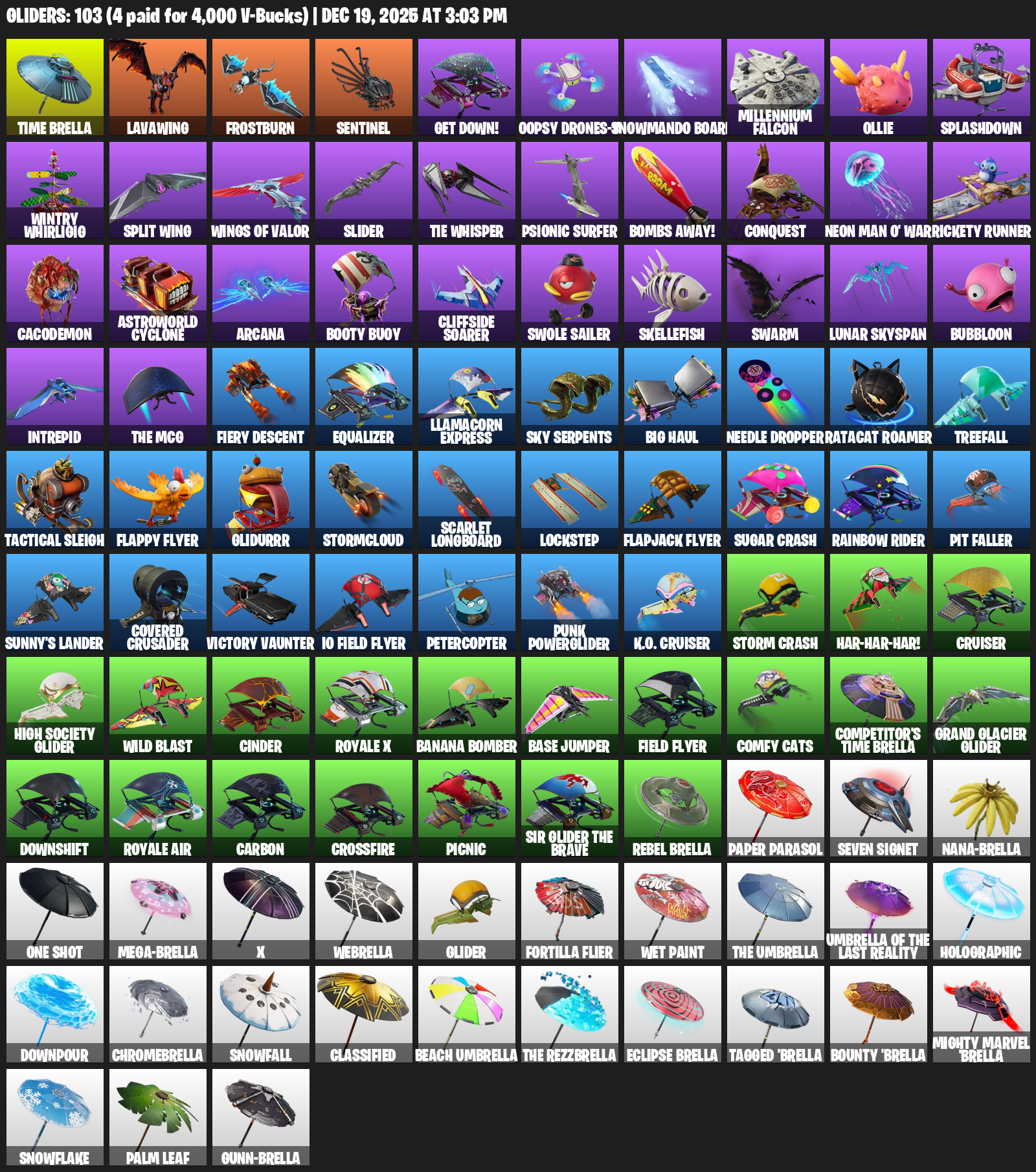 Time Brella, Lavawing, Frostburn, Sentinel, Get Down!, Oopsy Drones-y, Snowmando Board, Millennium Falcon, Ollie, Splashdown, Wintry Whirligig, Split Wing, Slider, TIE Whisper, Psionic Surfer, Bombs Away!, Conquest, Neon Man O’ War, Rickety Runner