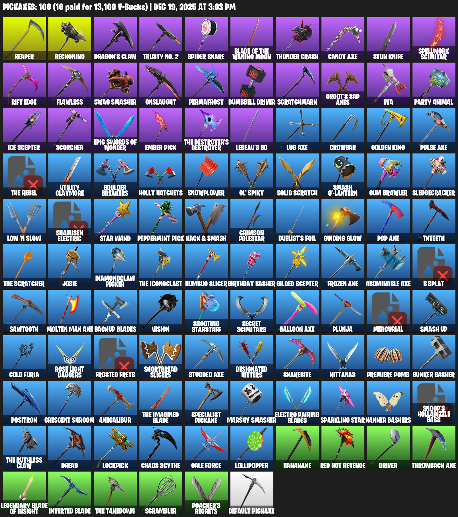 Reckoning, Dragon’s Claw, Trusty No. 2, Spider Snare, Thunder Crash, Candy Axe, Stun Knife, Spellwork Scimitar, Rift Edge, Flawless, Swag Smasher, Onslaught, Permafrost, Dumbbell Driver, Scratchmark, Groot’s Sap Axes, EVA, Party Animal