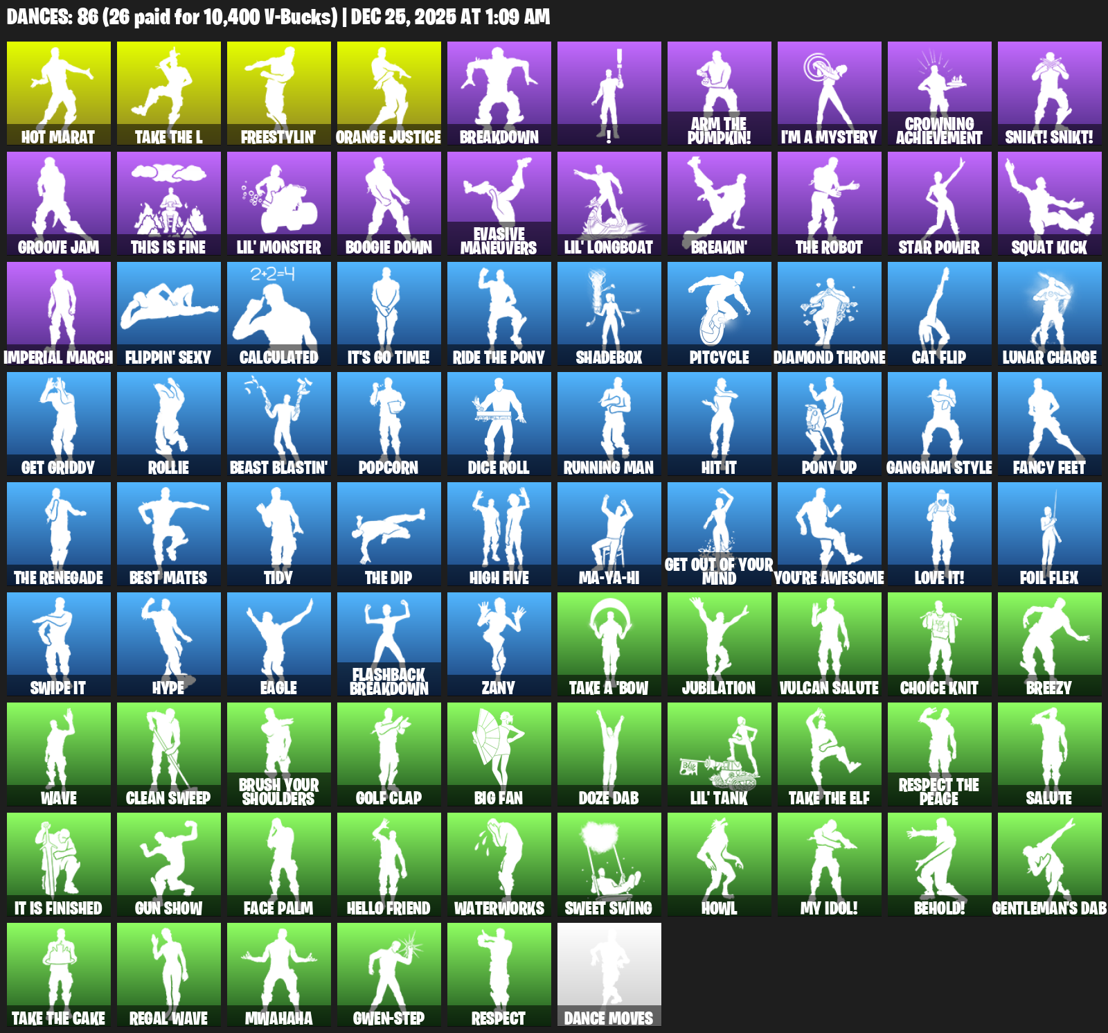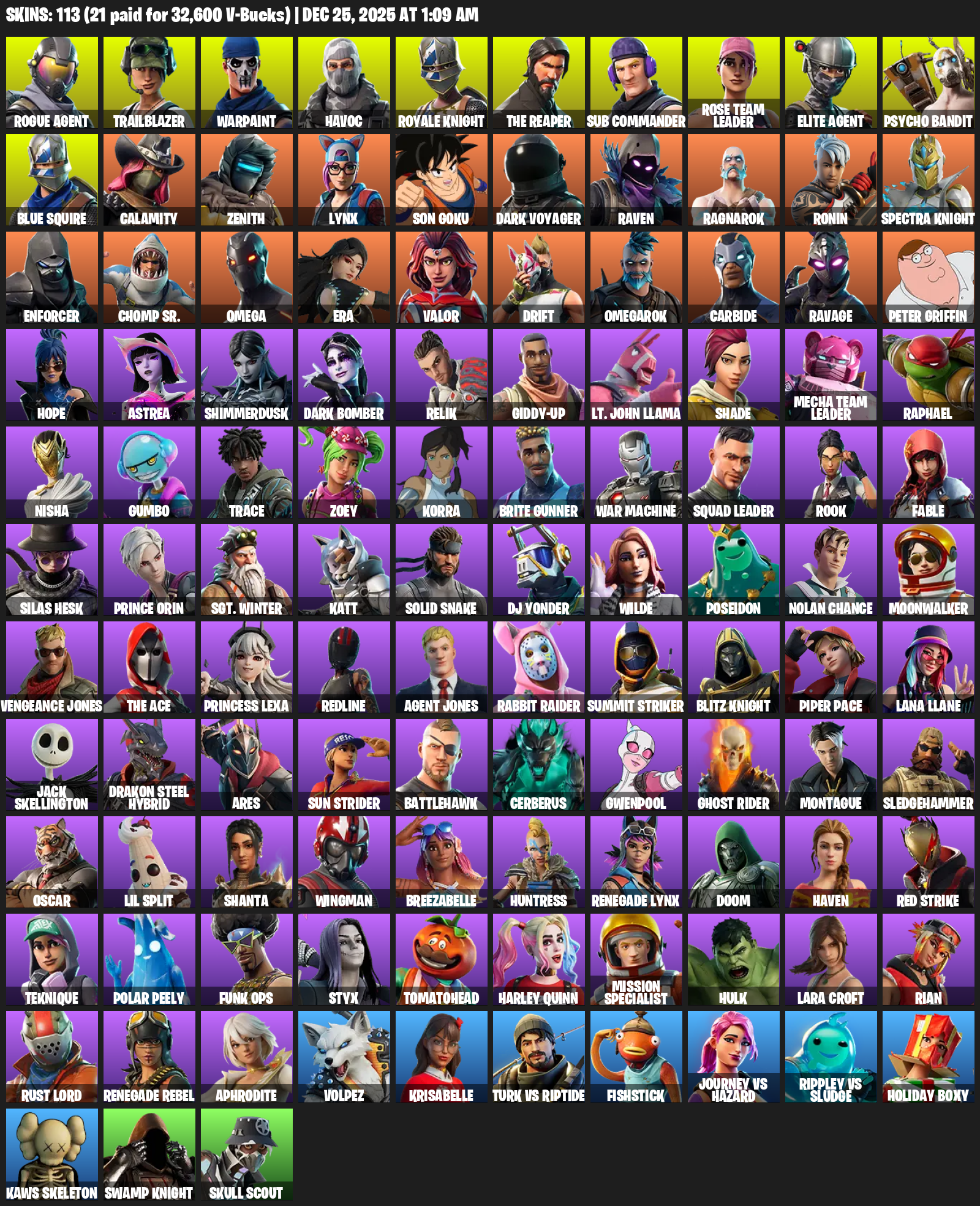 Royale Knight, The Reaper, Elite Agent, Blue Squire, Omega, Lara Croft, Trailblazer, Warpaint, Havoc, Sub Commander, Rose Team Leader, Psycho Bandit, Calamity, Zenith, Lynx, Son Goku, Dark Voyager, Raven, Ragnarok