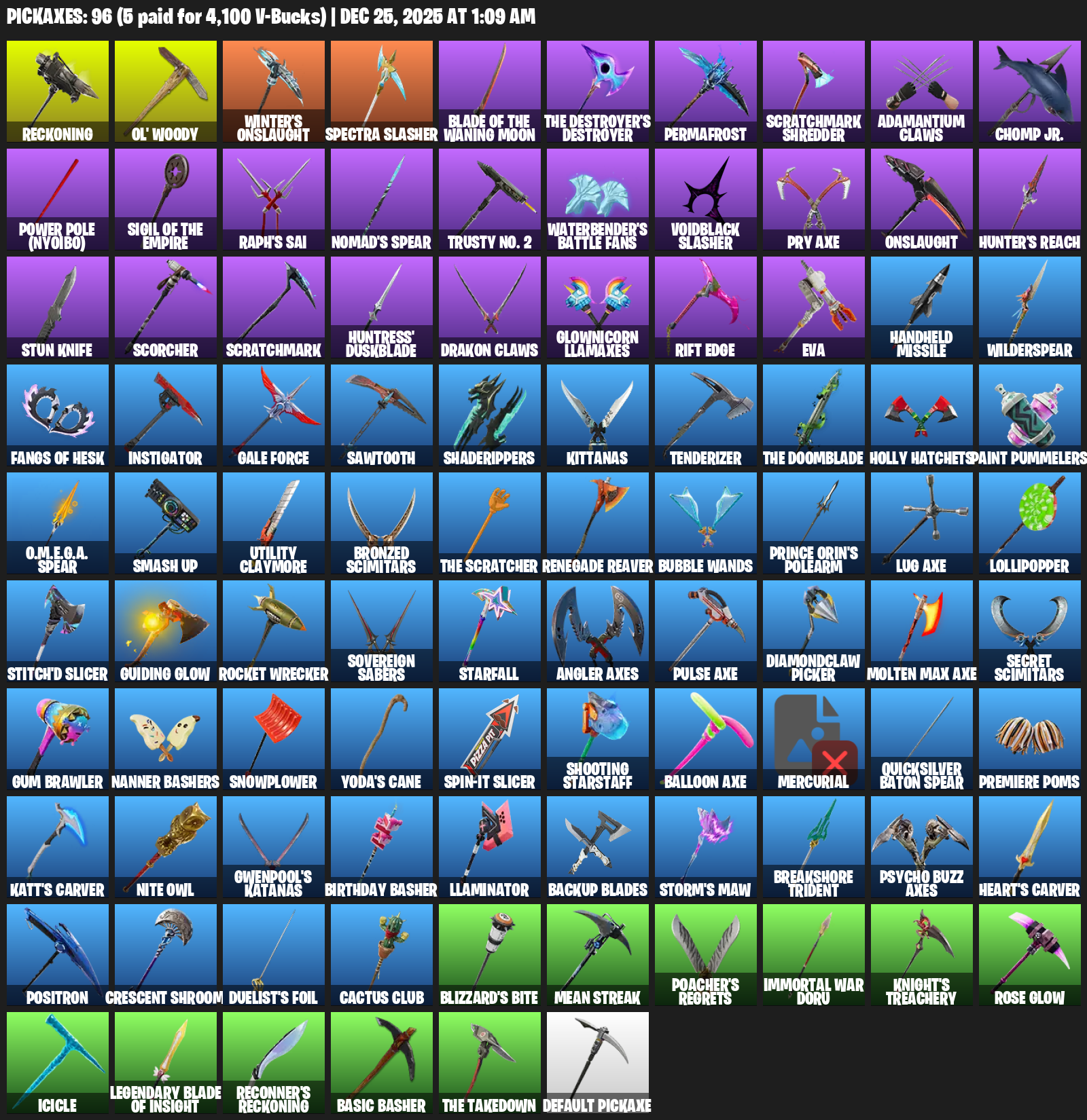 Reckoning, Ol’ Woody, Winter’s Onslaught, Spectra Slasher, Permafrost, Scratchmark Shredder, Adamantium Claws, Chomp Jr., Power Pole (Nyoibo), Raph’s Sai, Nomad’s Spear, Trusty No. 2, Waterbender’s Battle Fans, Pry Axe, Hunter’s Reach