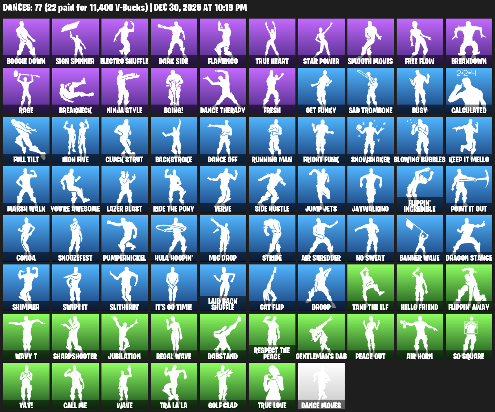 Boogie Down, Sign Spinner, Electro Shuffle, Flamenco, True Heart, Star Power, Smooth Moves, Free Flow, Breakdown, Rage, Breakneck, Ninja Style, Boing!, Dance Therapy, Fresh, Get Funky, Sad Trombone, Busy, Calculated