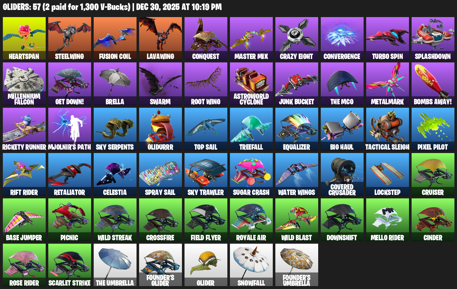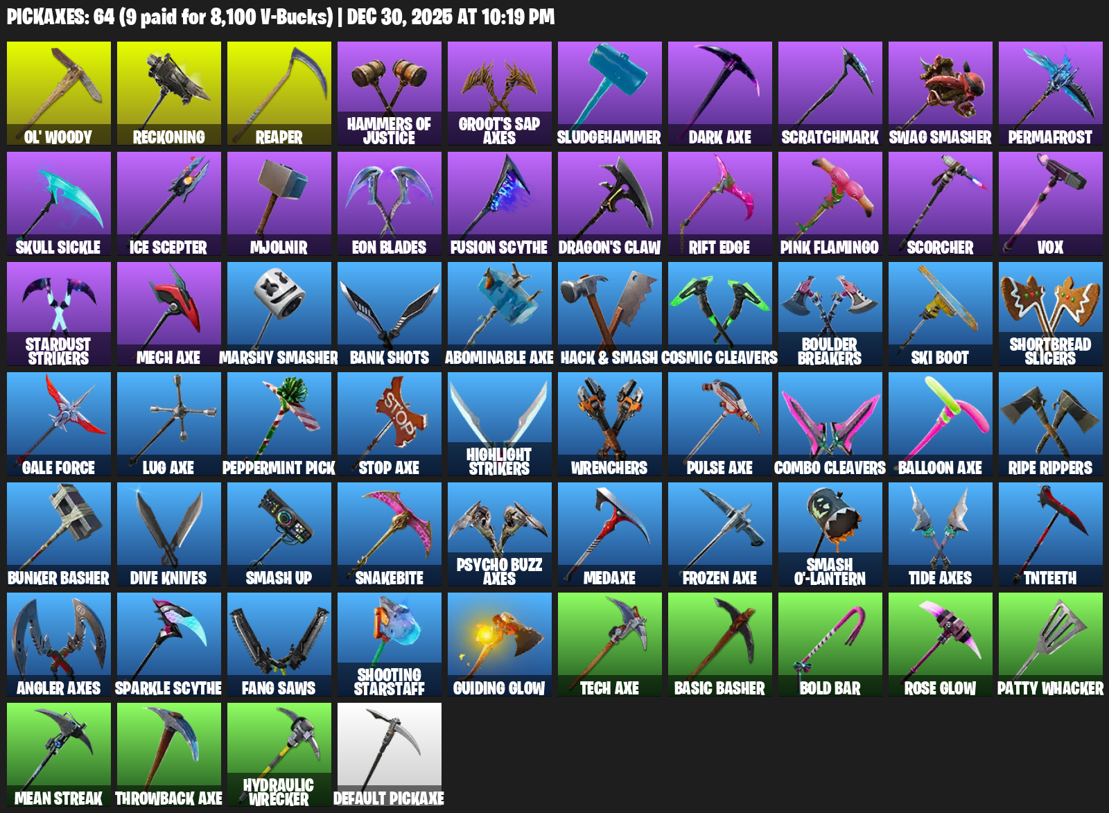 Ol’ Woody, Reckoning, Reaper, Hammers of Justice, Groot’s Sap Axes, Sludgehammer, Scratchmark, Swag Smasher, Permafrost, Skull Sickle, Ice Scepter, Mjolnir, Eon Blades, Fusion Scythe, Dragon’s Claw, Rift Edge, Pink Flamingo, Scorcher, Vox