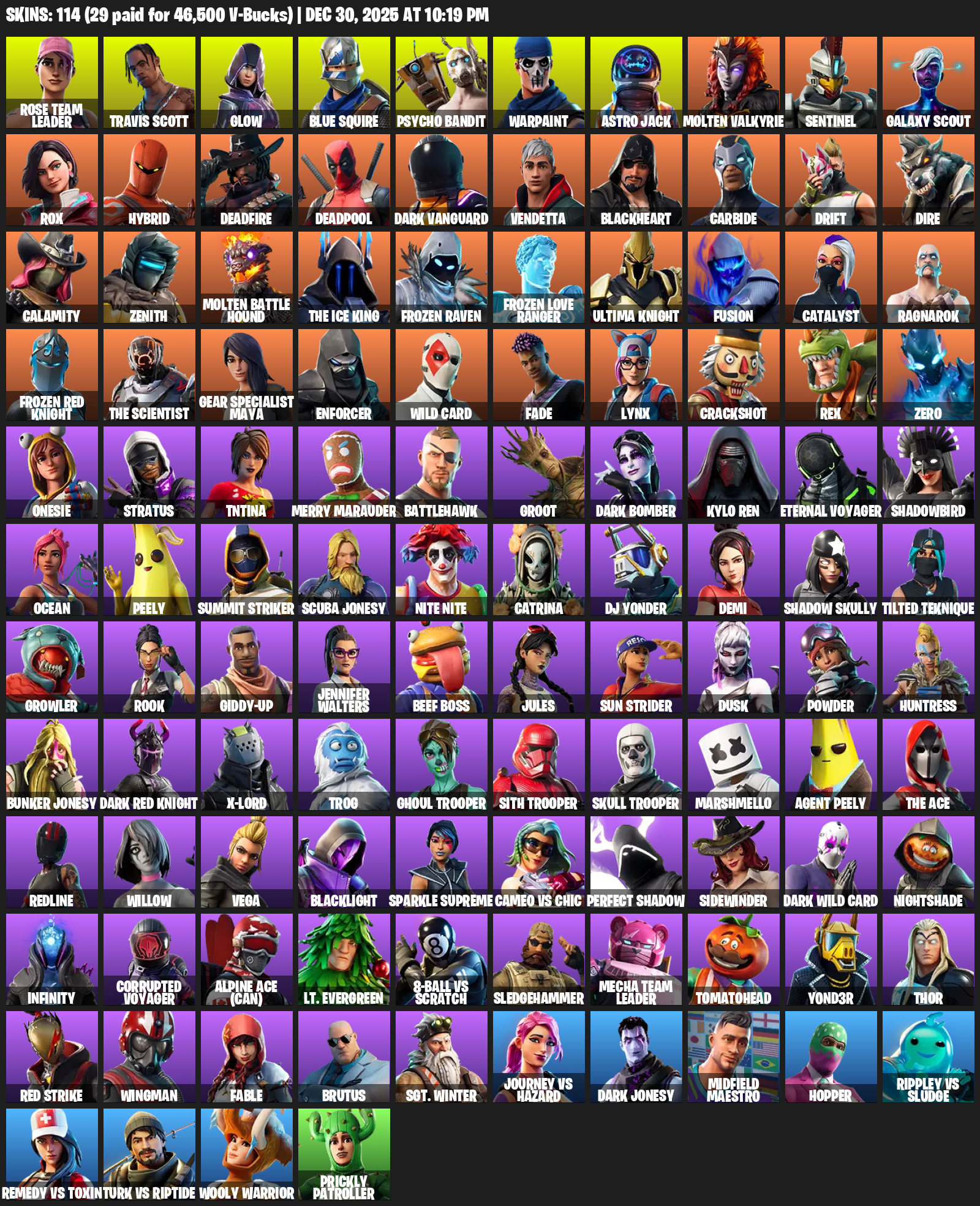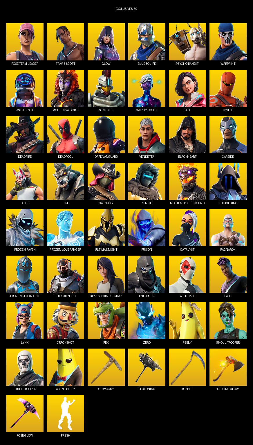 Travis Scott, Blue Squire, Gear Specialist Maya, Rose Team Leader, Glow, Psycho Bandit, Warpaint, Astro Jack, Molten Valkyrie, Sentinel, Galaxy Scout, Rox, Hybrid, Deadfire, Deadpool, Dark Vanguard, Vendetta, Blackheart, Carbide, Drift