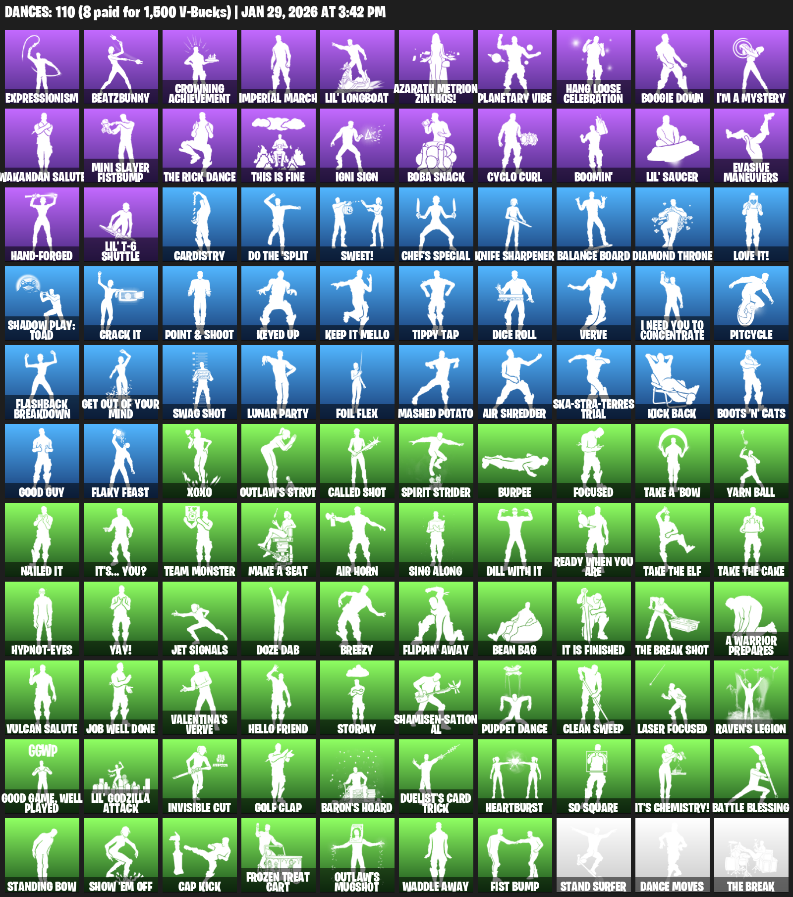 Expressionism, BeatzBunny, Crowning Achievement, Imperial March, Lil’ Longboat, Azarath Metrion Zinthos!, Planetary Vibe, Hang Loose Celebration, Boogie Down, I’m a Mystery, Wakandan Salute, Mini Slayer Fistbump, This is Fine, Igni Sign, Boba Snack, Cyclo Curl, Boomin’, Evasive Maneuvers