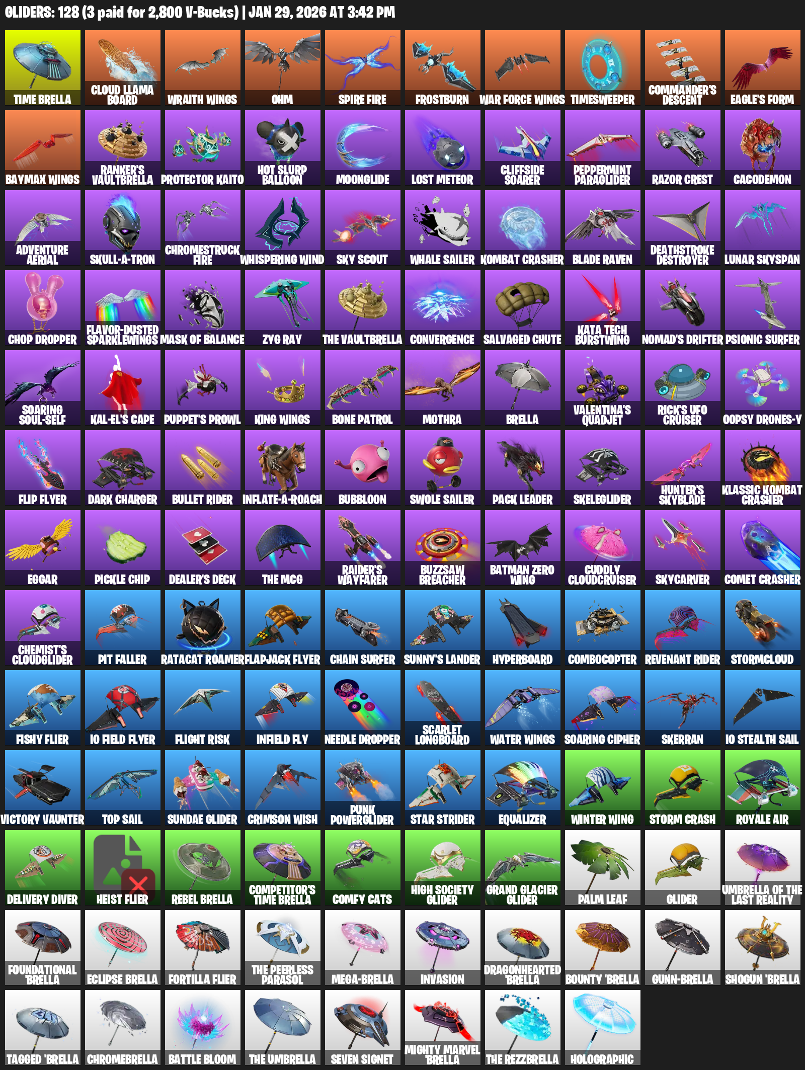 Time Brella, Cloud Llama Board, Wraith Wings, Ohm, Frostburn, Timesweeper, Commander’s Descent, Eagle’s Form, Ranker’s Vaultbrella, Protector Kaito, Hot Slurp Balloon, Moonglide, Lost Meteor, Cliffside Soarer, Peppermint Paraglider, Razor Crest, Cacodemon