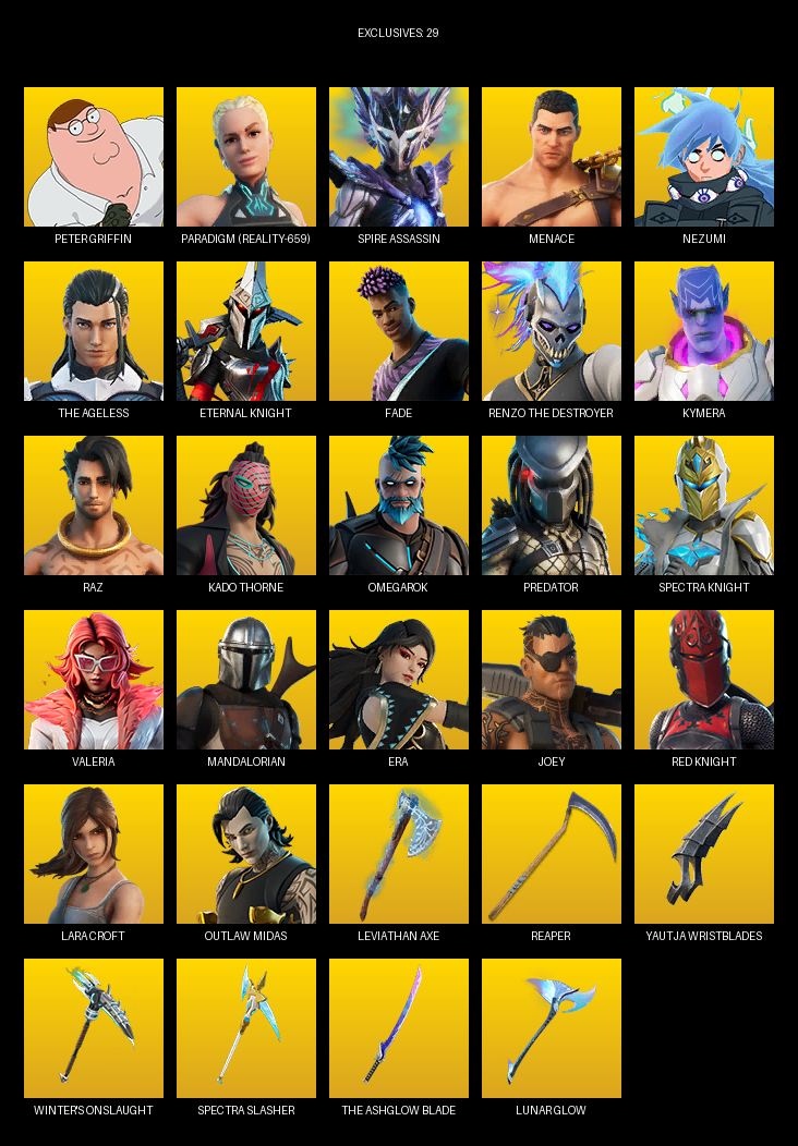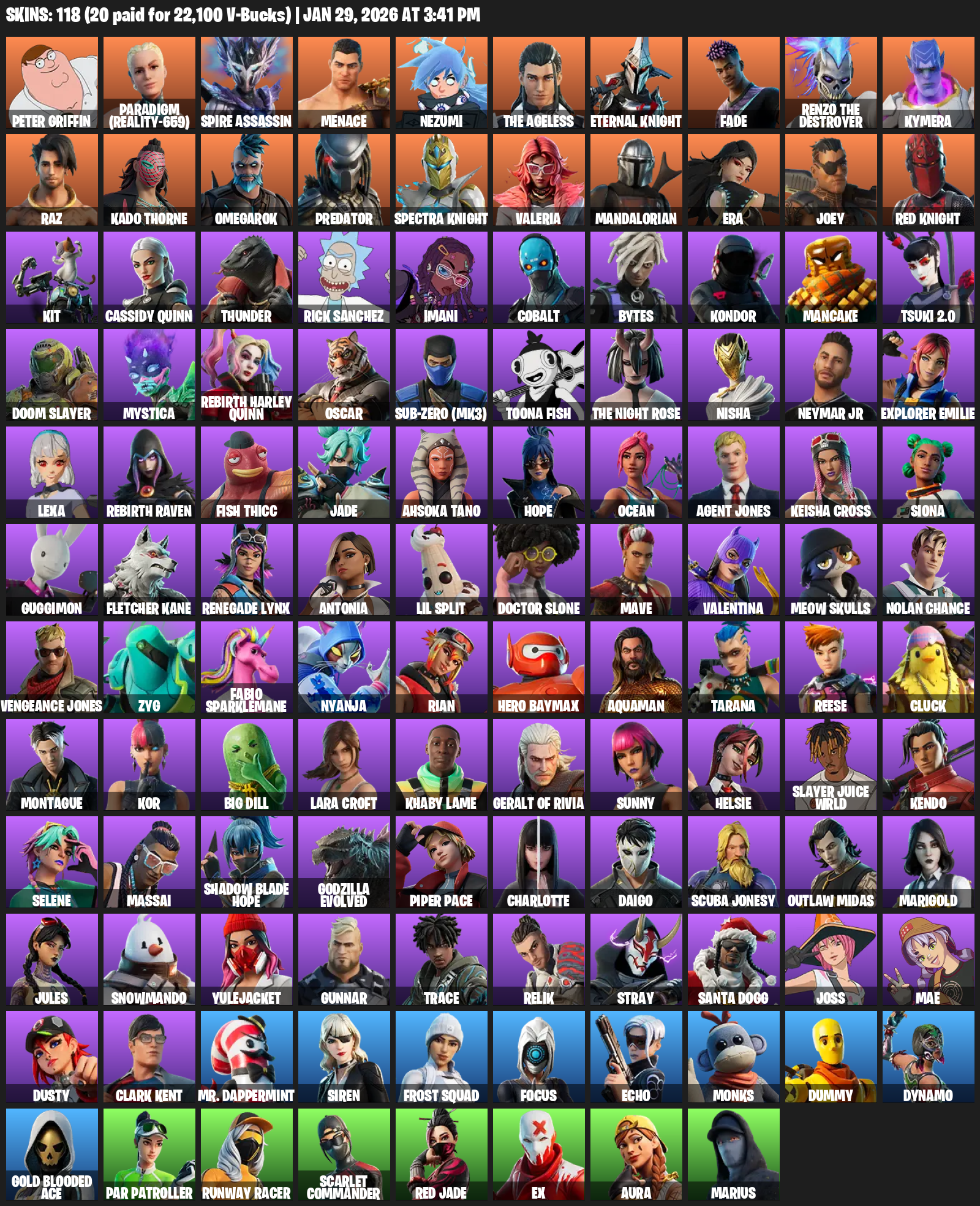 [PC/PSN] | 118 skins | 1050 V-bucks | Leviathan Axe | Lara Croft | Peter Griffin | Paradigm (Reality-659) | Spire Assassin | Menace | #VDS5747