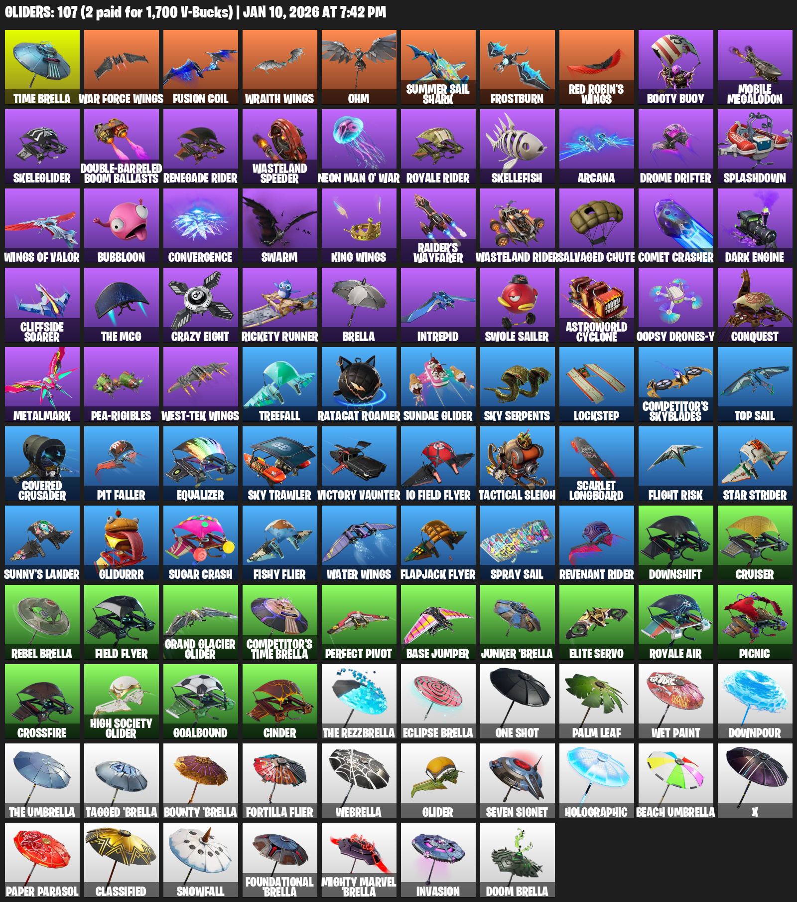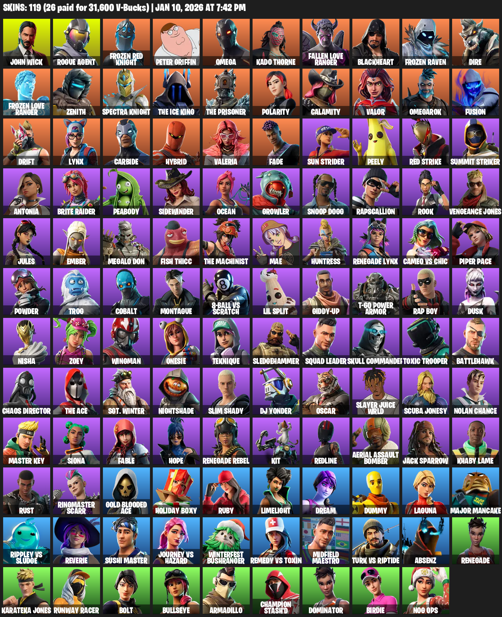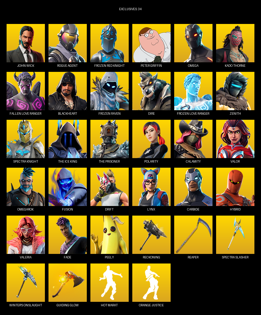 Omega, John Wick, Rogue Agent, Frozen Red Knight, Peter Griffin, Kado Thorne, Fallen Love Ranger, Blackheart, Dire, Zenith, The Ice King, Polarity, Calamity, Valor, Omegarok, Fusion