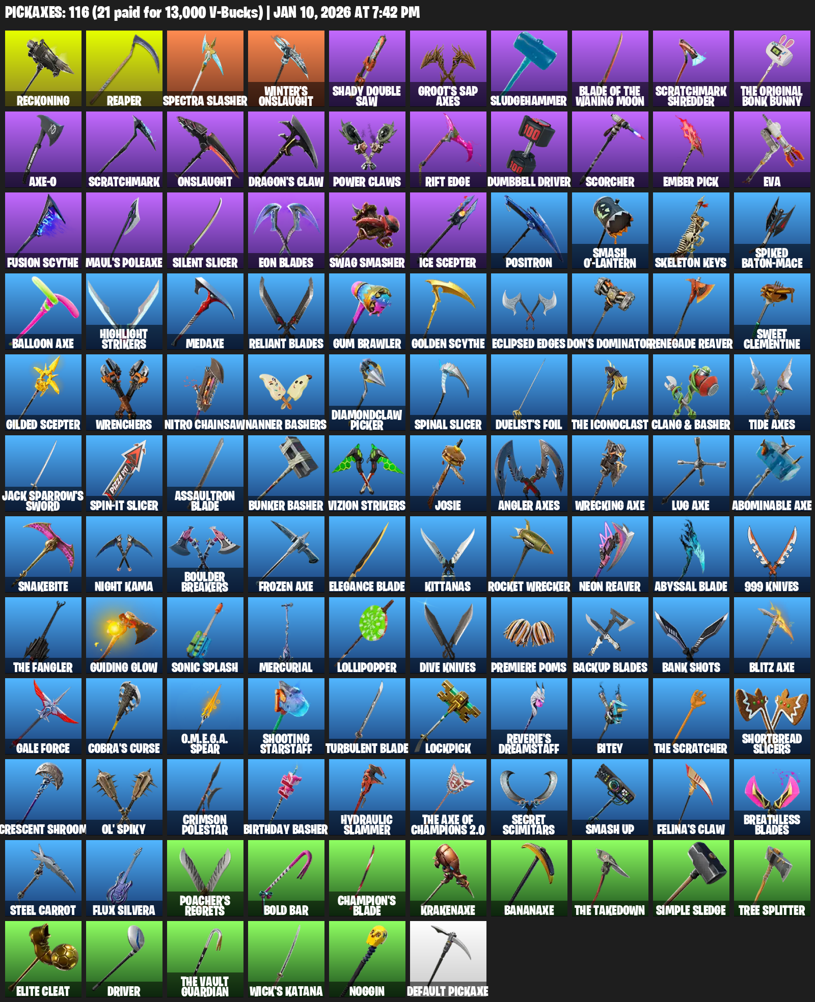 Reckoning, Reaper, Spectra Slasher, Winter’s Onslaught, Shady Double Saw, Groot’s Sap Axes, Sludgehammer, Scratchmark Shredder, aXe-O, Dragon’s Claw, Power Claws, Rift Edge, Dumbbell Driver, Scorcher, Ember Pick, EVA
