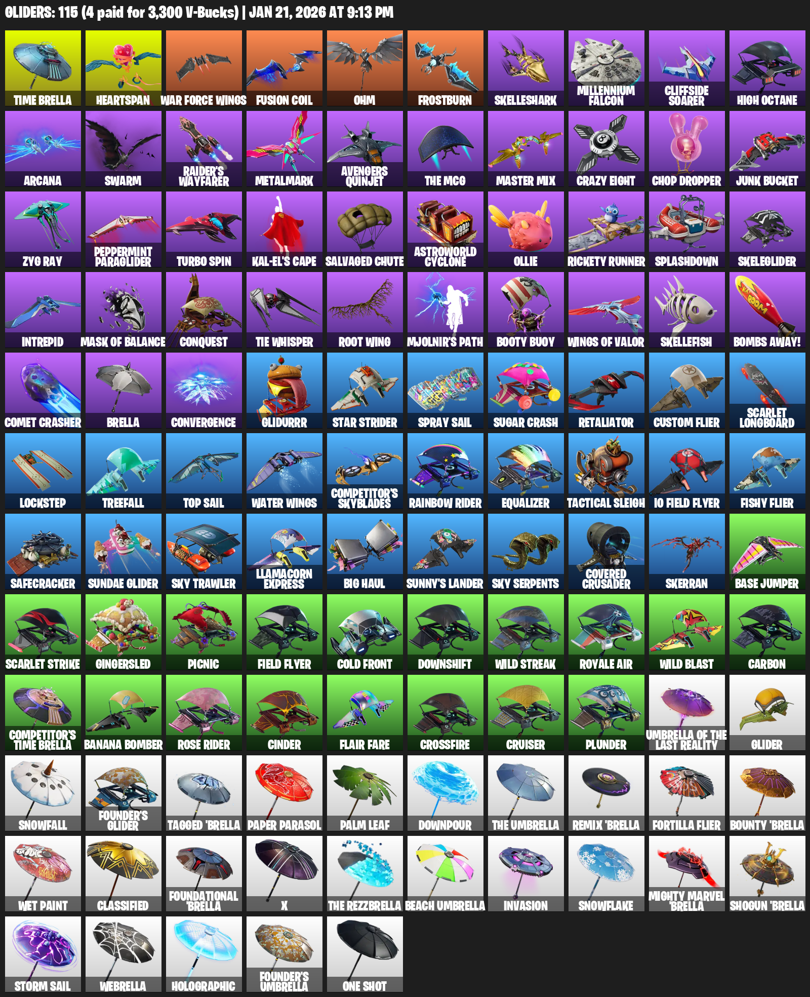 Time Brella, Heartspan, War Force Wings, Ohm, Frostburn, Skelleshark, Millennium Falcon, Cliffside Soarer, High Octane, Arcana, Swarm, Raider’s Wayfarer, Metalmark, Avengers Quinjet, Crazy Eight, Chop Dropper, Junk Bucket
