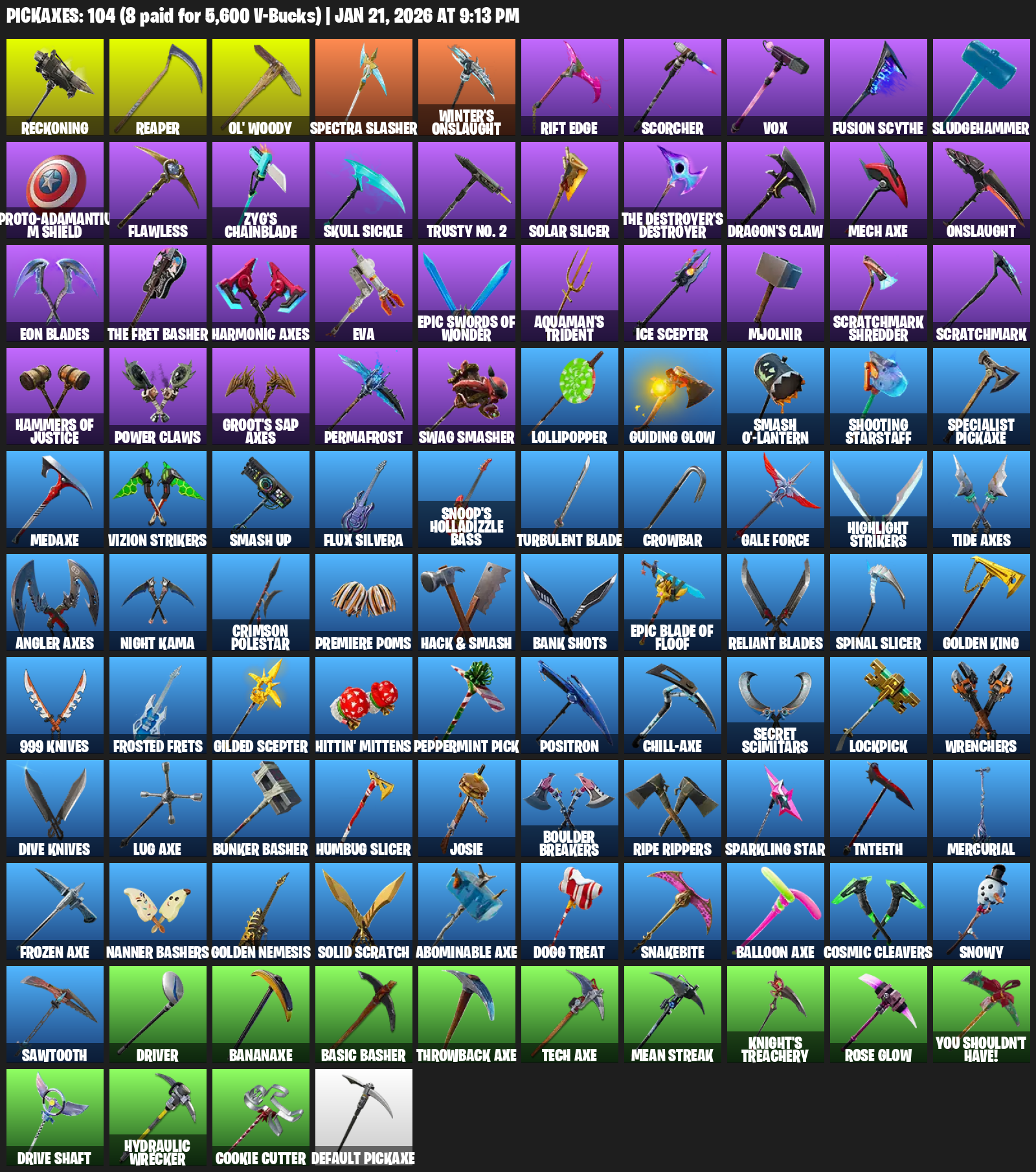 Reckoning, Ol’ Woody, Spectra Slasher, Winter’s Onslaught, Rift Edge, Scorcher, Vox, Fusion Scythe, Sludgehammer, Proto-Adamantium Shield, Flawless, Zyg’s Chainblade, Skull Sickle, Trusty No. 2, Solar Slicer, Dragon’s Claw, Mech Axe
