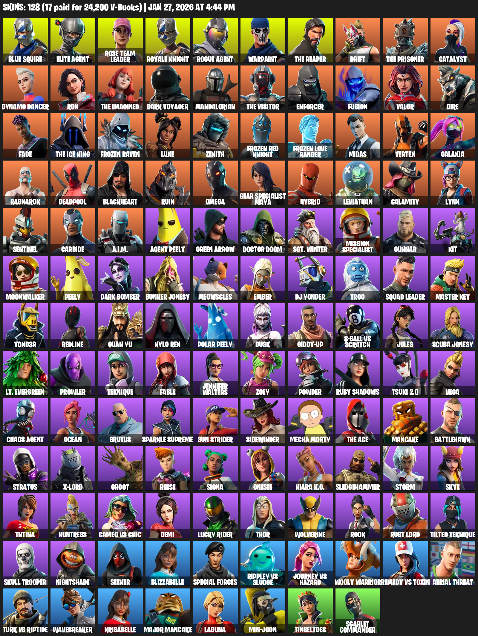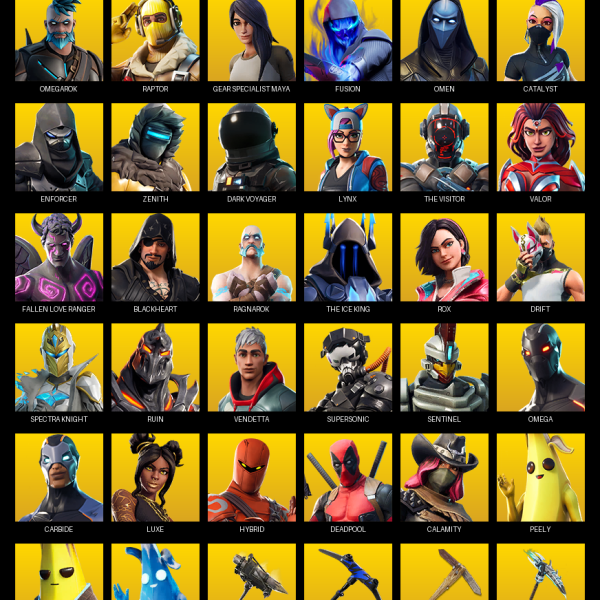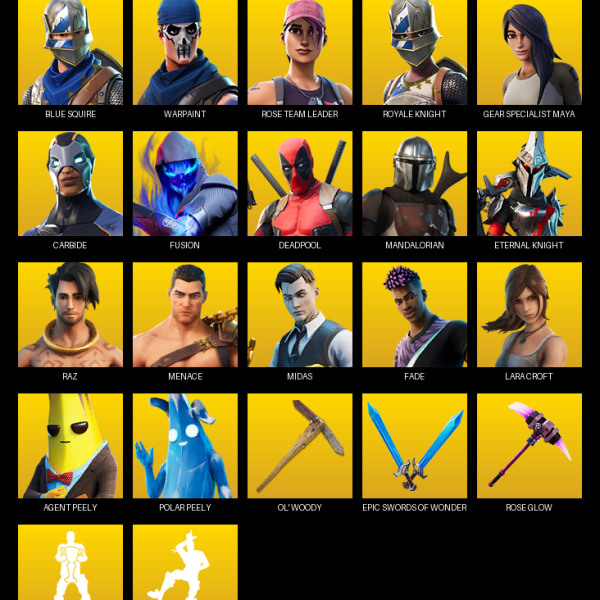 Blue Squire, Elite Agent, Royale Knight, The Reaper, Omega, Gear Specialist Maya, Rose Team Leader, Warpaint, Drift, Catalyst, Dynamo Dancer, Rox, Dark Voyager, Mandalorian, Enforcer, Fusion