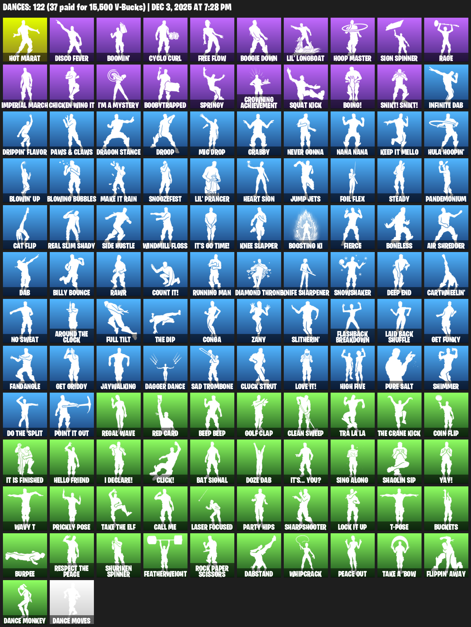 Hot Marat, Disco Fever, Boomin’, Cyclo Curl, Free Flow, Boogie Down, Lil’ Longboat, Hoop Master, Sign Spinner, Rage, Imperial March, Chicken Wing It, I’m a Mystery, Boobytrapped, Springy, Crowning Achievement, Squat Kick, Boing!, Snikt! Snikt!, Infinite Dab