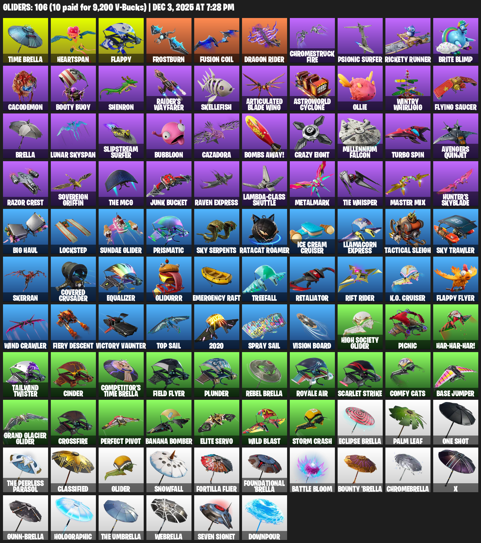 Time Brella, Heartspan, Flappy, Frostburn, Chromestruck Fire, Psionic Surfer, Rickety Runner, Brite Blimp, Cacodemon, Booty Buoy, Shenron, Raider’s Wayfarer, Skellefish, Astroworld Cyclone, Ollie, Wintry Whirligig, Flying Saucer