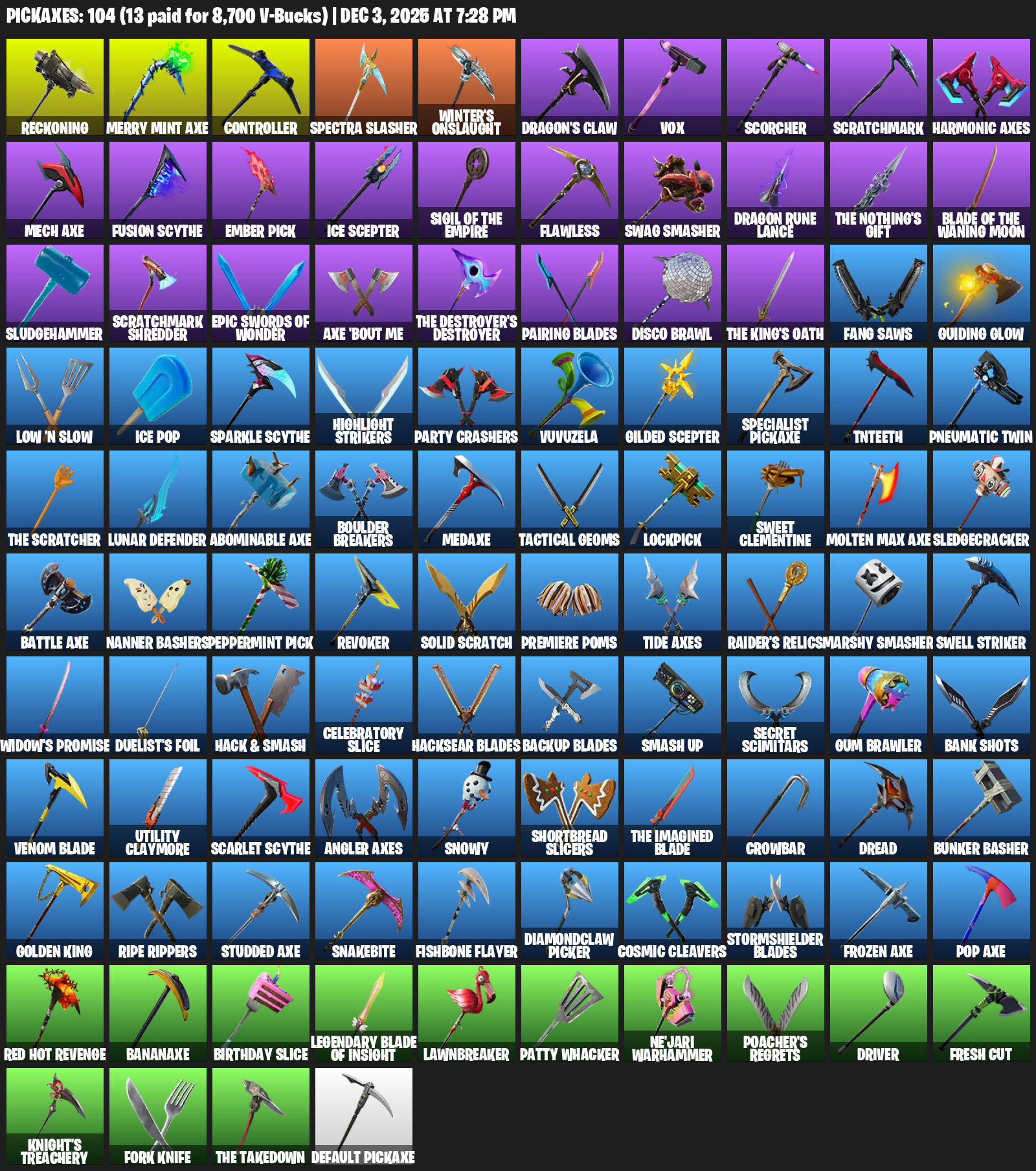 Merry Mint Axe, Reckoning, Controller, Spectra Slasher, Winter’s Onslaught, Dragon’s Claw, Vox, Scorcher, Scratchmark, Harmonic Axes, Ember Pick, Ice Scepter, Flawless, Swag Smasher, Dragon Rune Lance