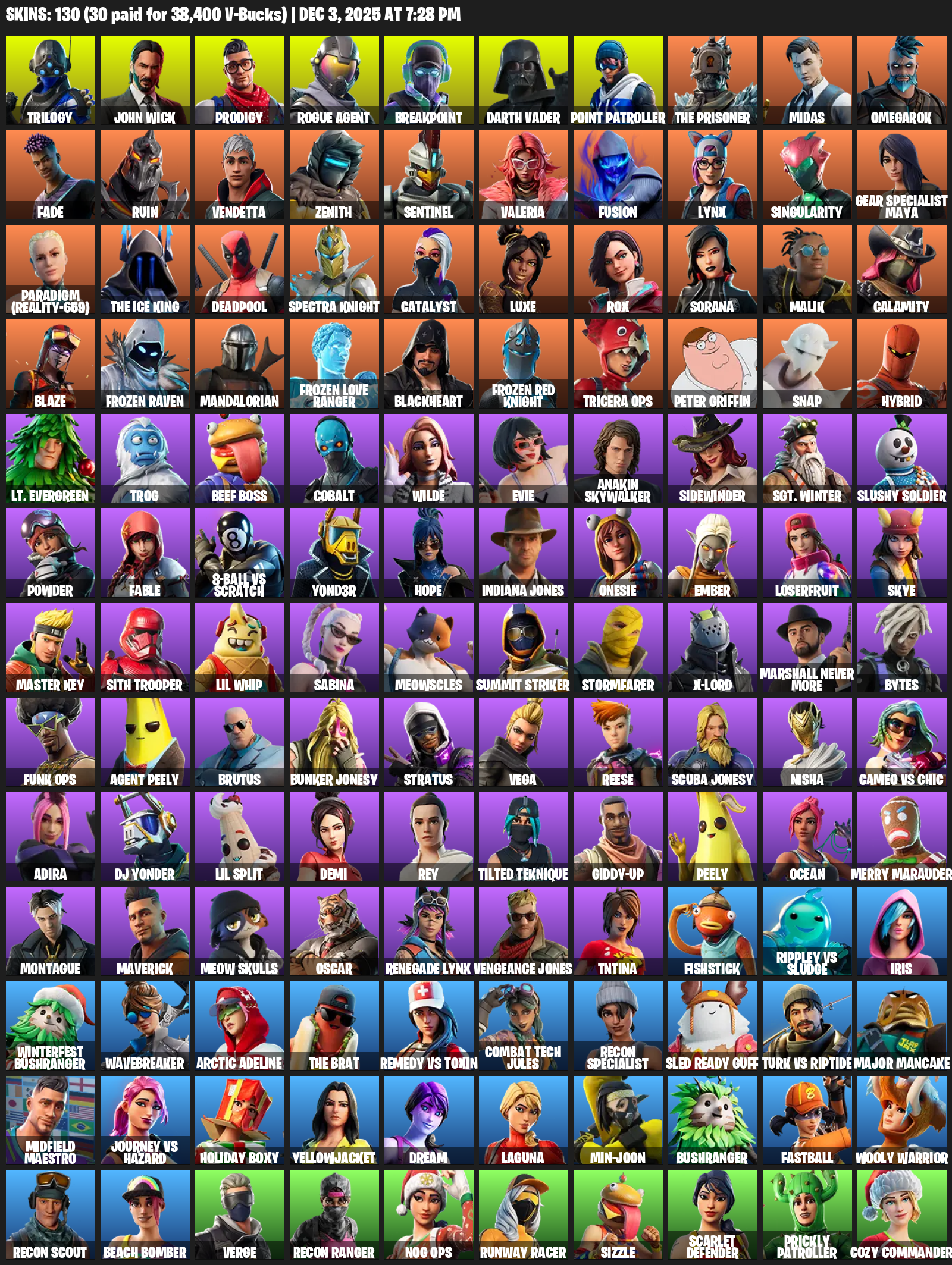 [PC/PSN] | 130 skins | Merry Mint Axe | Trilogy | John Wick | Prodigy | Rogue Agent | Breakpoint | Darth Vader | Point Patroller | #USN9002