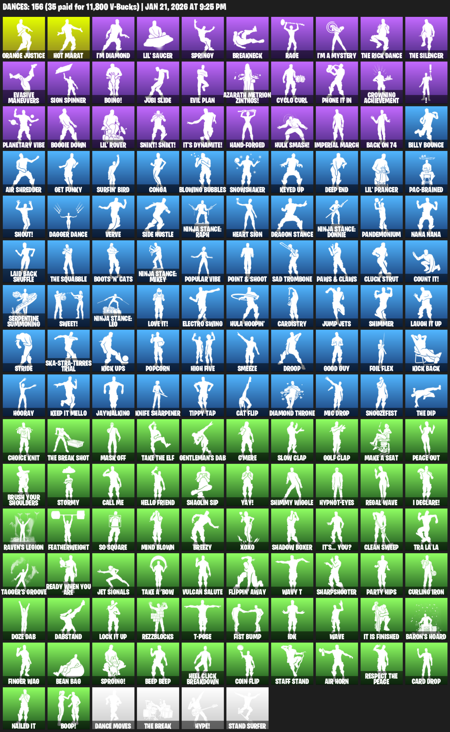 Hot Marat, Orange Justice, I’m Diamond, Lil’ Saucer, Springy, Breakneck, Rage, Evasive Maneuvers, Sign Spinner, Boing!, Jubi Slide, Evil Plan, Azarath Metrion Zinthos!, Cyclo Curl, Phone It In, Crowning Achievement, !