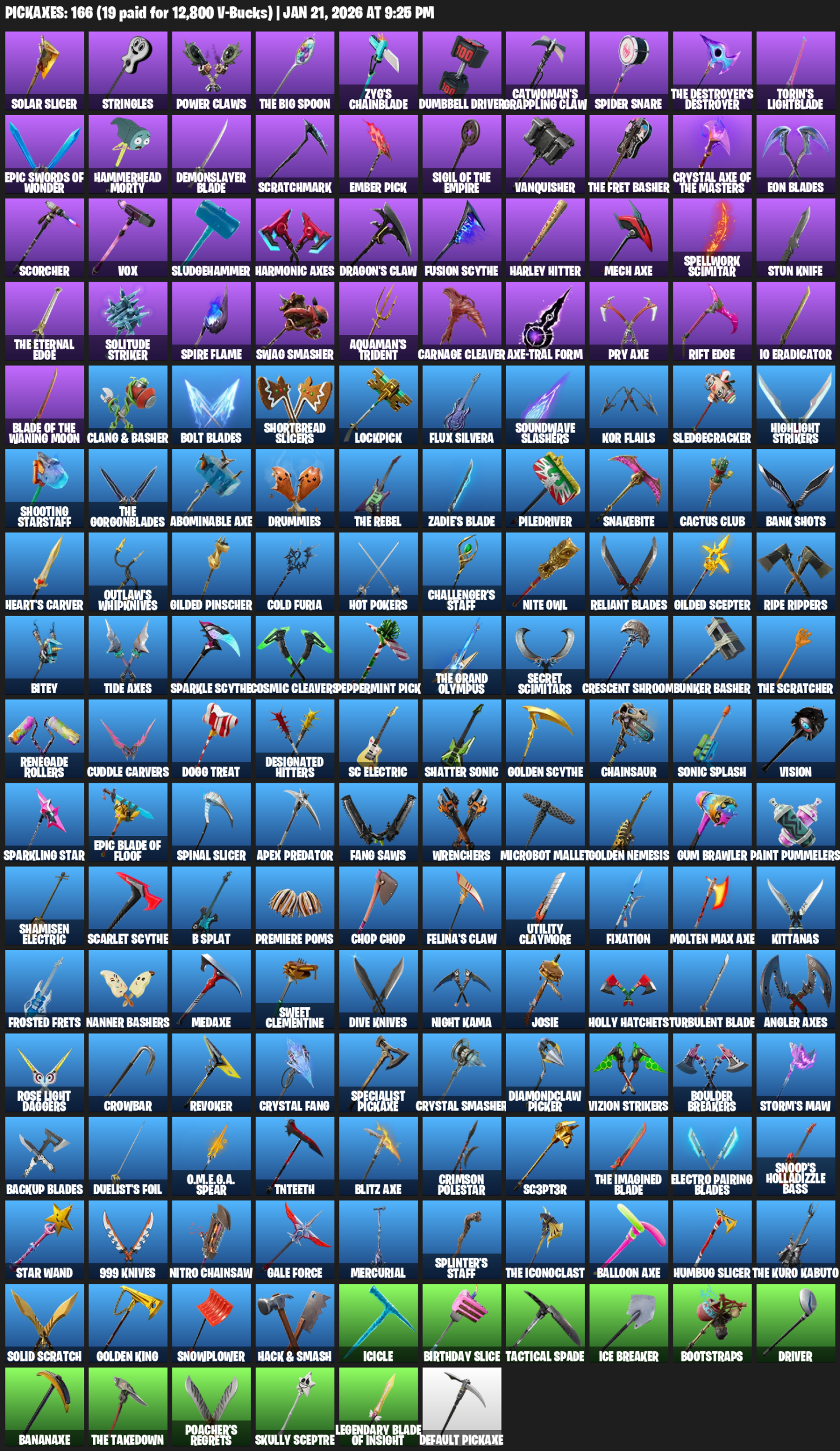 Solar Slicer, Stringles, Power Claws, The Big Spoon, Zyg’s Chainblade, Dumbbell Driver, Catwoman’s Grappling Claw, Spider Snare, Torin’s Lightblade, Hammerhead Morty, Demonslayer Blade, Scratchmark, Ember Pick, Vanquisher, Eon Blades