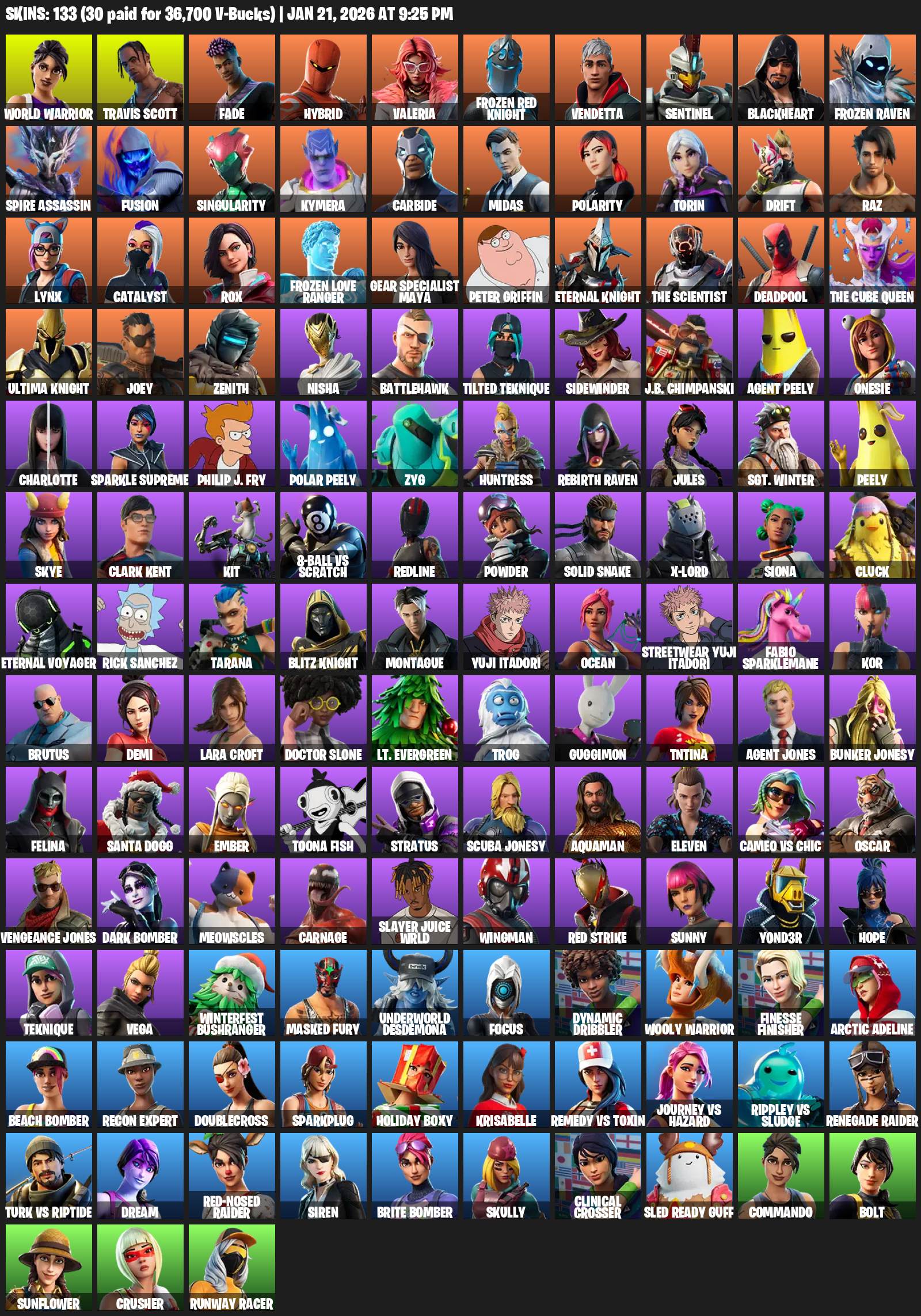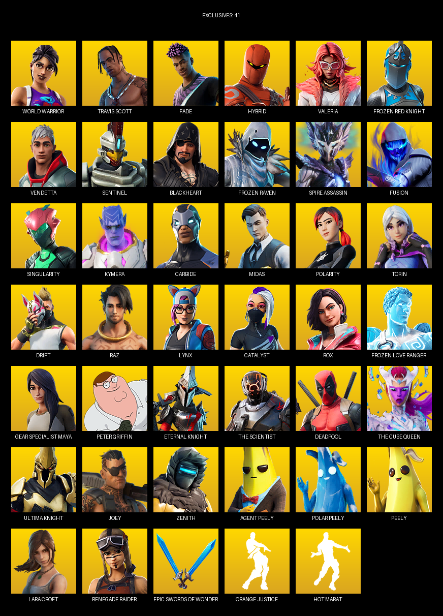Travis Scott, Gear Specialist Maya, Lara Croft, Renegade Raider, World Warrior, Fade, Hybrid, Valeria, Frozen Red Knight, Vendetta, Sentinel, Blackheart, Spire Assassin, Fusion, Singularity, Kymera, Carbide, Midas, Polarity