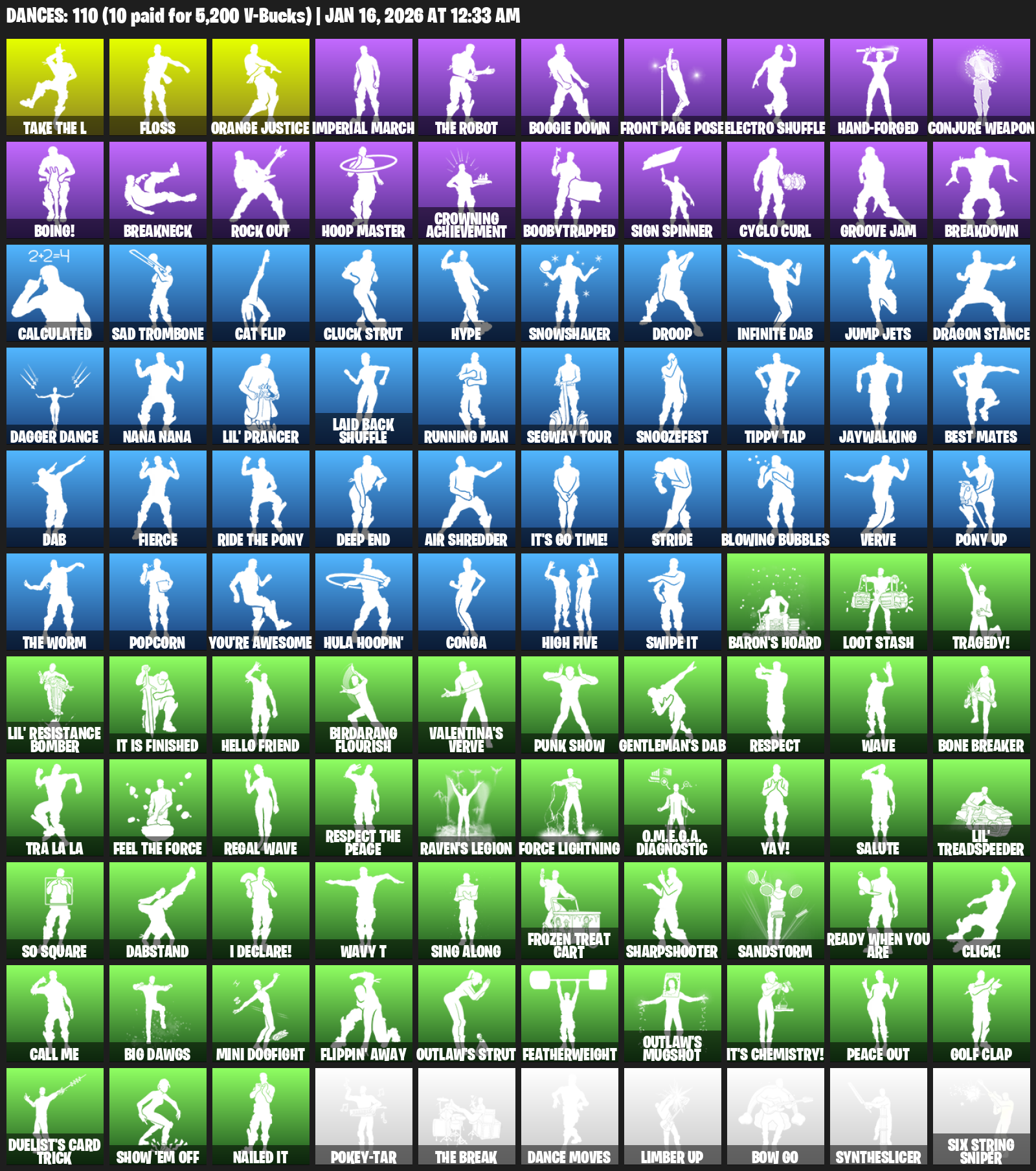 Floss, Orange Justice, Imperial March, Boogie Down, Front Page Pose, Electro Shuffle, Hand-Forged, Conjure Weapon, Boing!, Breakneck, Rock Out, Hoop Master, Crowning Achievement, Boobytrapped, Sign Spinner, Cyclo Curl, Groove Jam, Breakdown