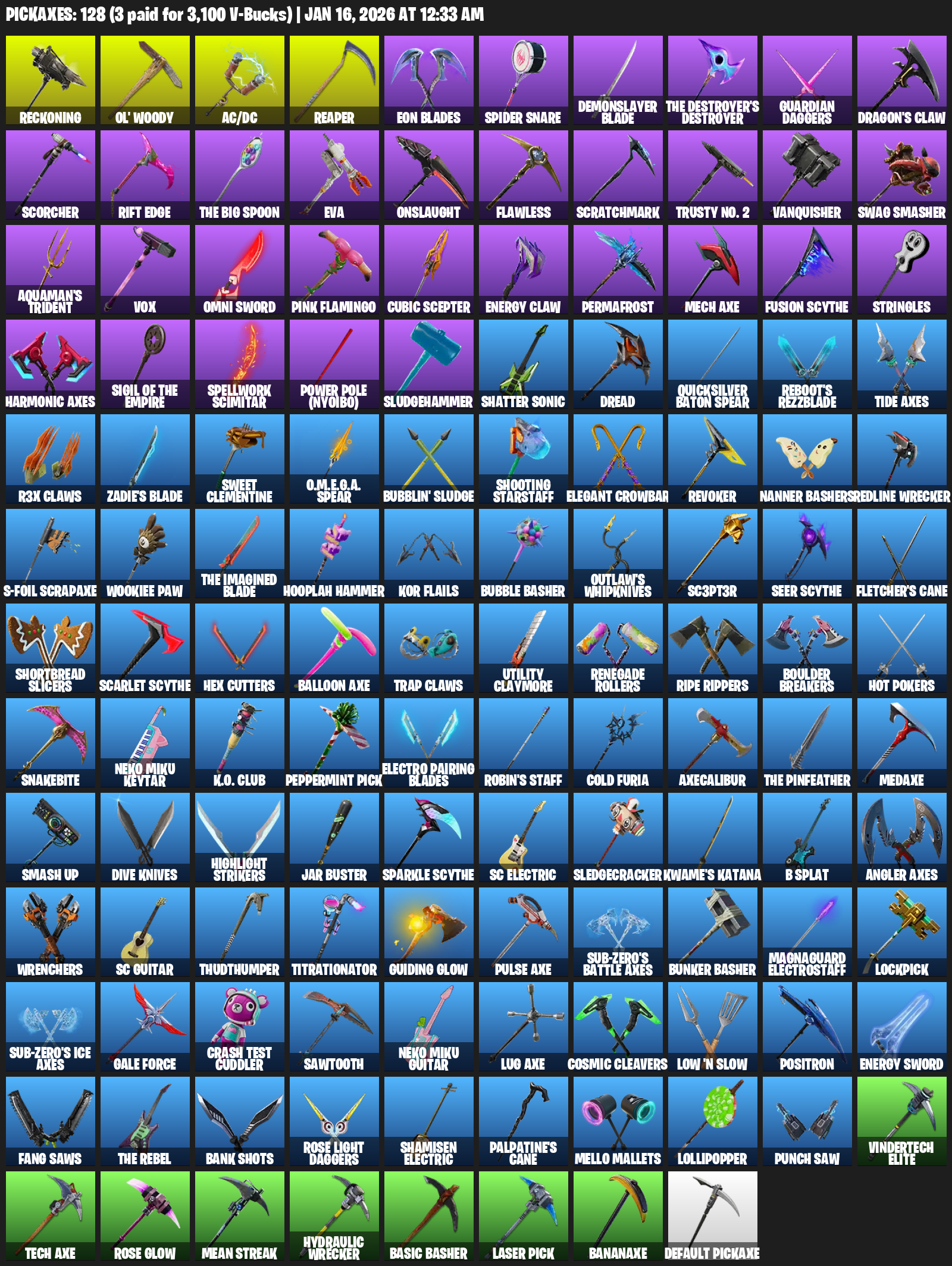 Reckoning, Ol’ Woody, AC/DC, Eon Blades, Spider Snare, Demonslayer Blade, Guardian Daggers, Dragon’s Claw, Scorcher, Rift Edge, EVA, Onslaught, Flawless, Scratchmark, Trusty No. 2, Vanquisher, Swag Smasher
