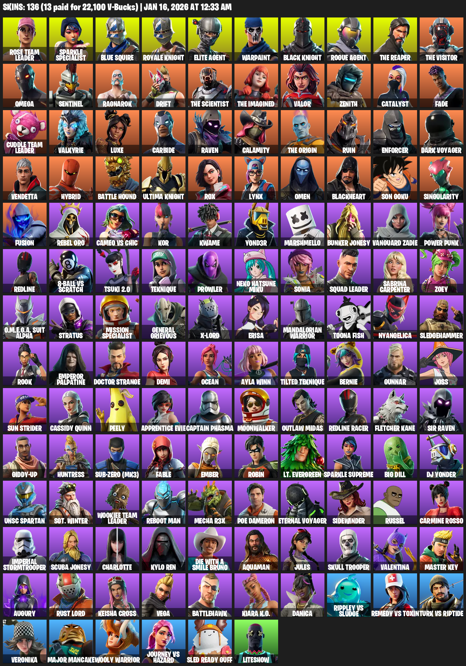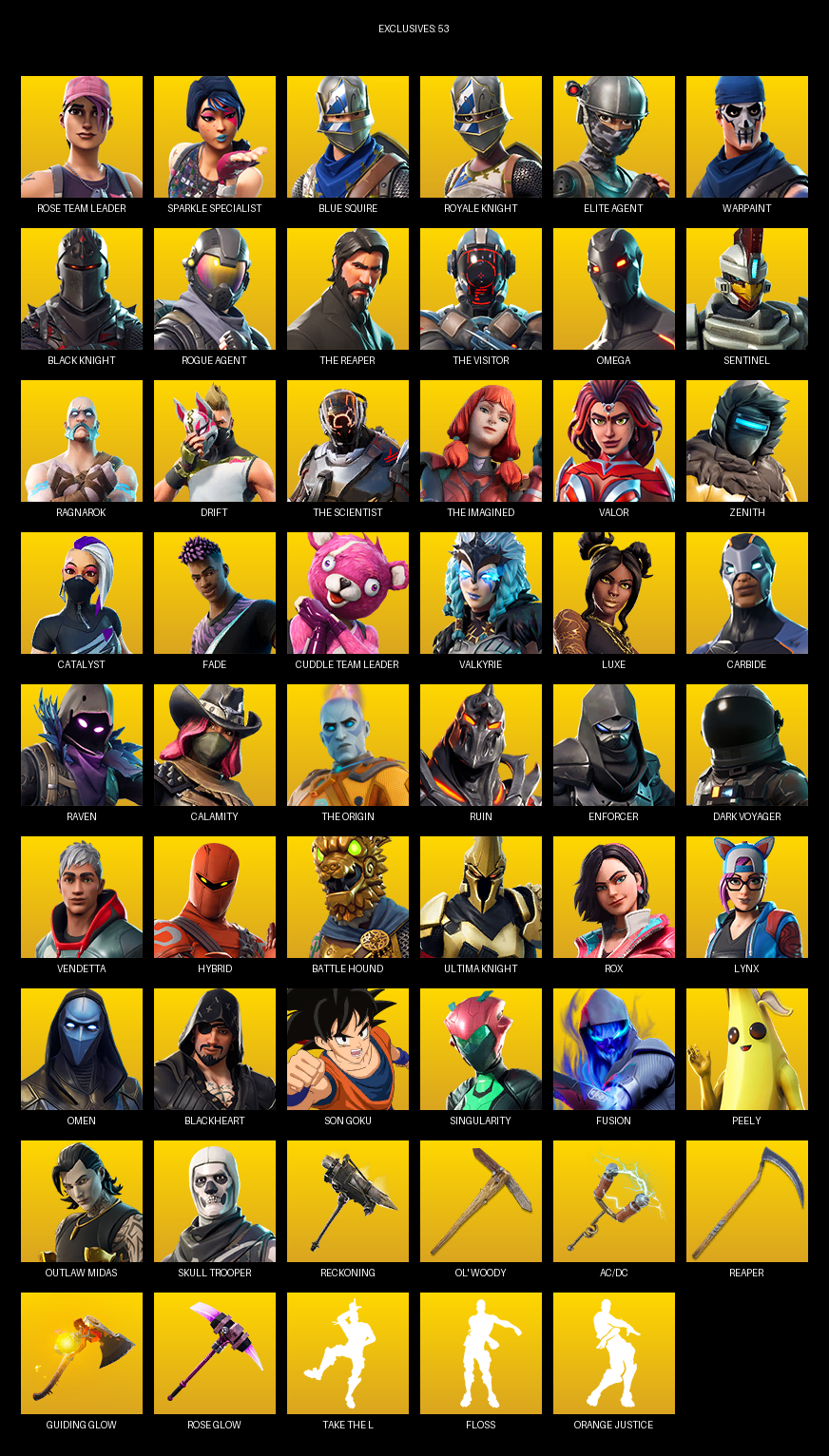 Sparkle Specialist, Blue Squire, Royale Knight, Elite Agent, The Reaper, Omega, Rose Team Leader, Warpaint, Sentinel, Ragnarok, Drift, Valor, Zenith, Catalyst, Fade
