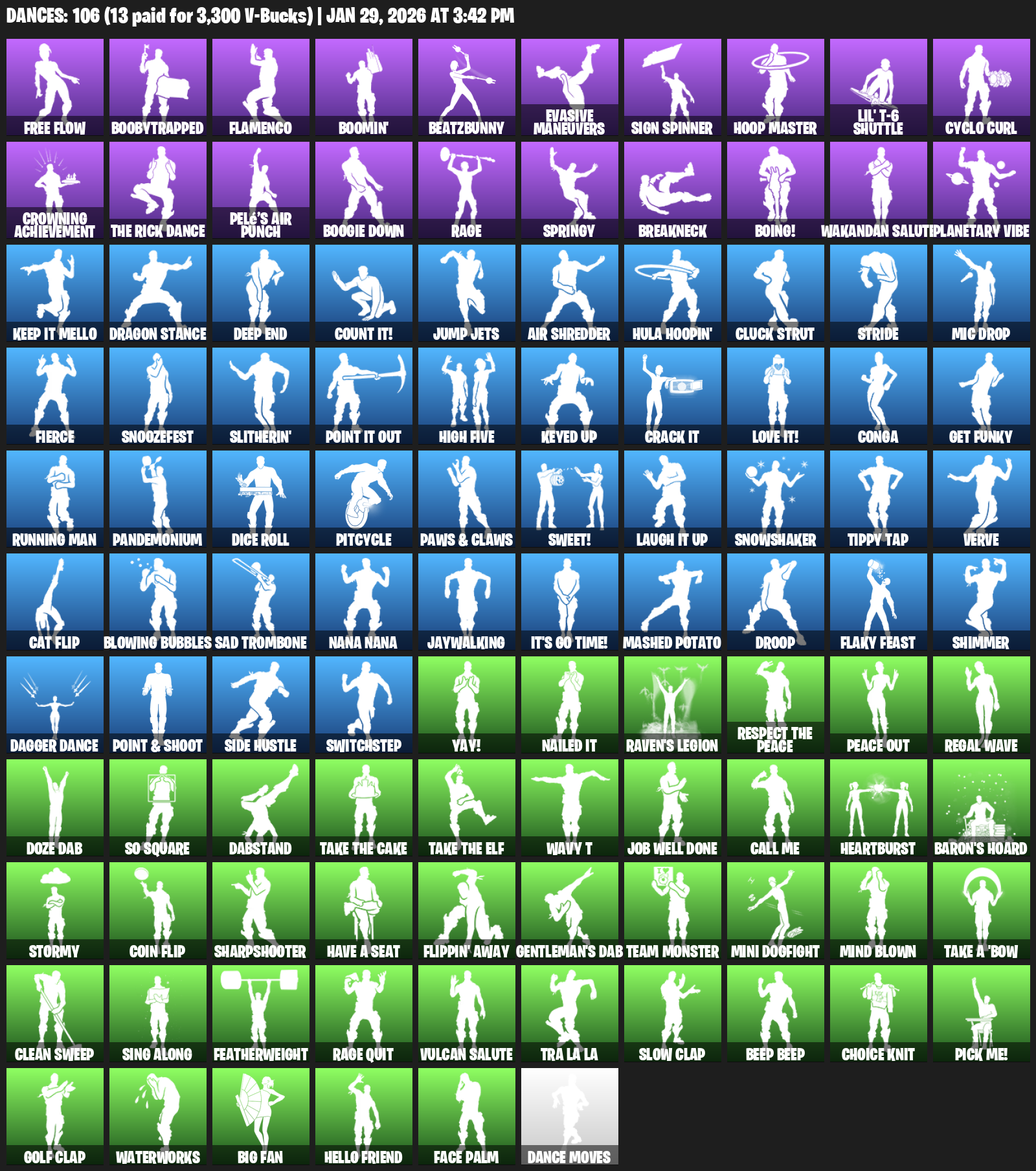 Free Flow, Boobytrapped, Flamenco, Boomin’, BeatzBunny, Evasive Maneuvers, Sign Spinner, Hoop Master, Lil’ T-6 Shuttle, Cyclo Curl, Crowning Achievement, Pelé’s Air Punch, Boogie Down, Rage, Springy, Breakneck, Boing!, Wakandan Salute, Planetary Vibe