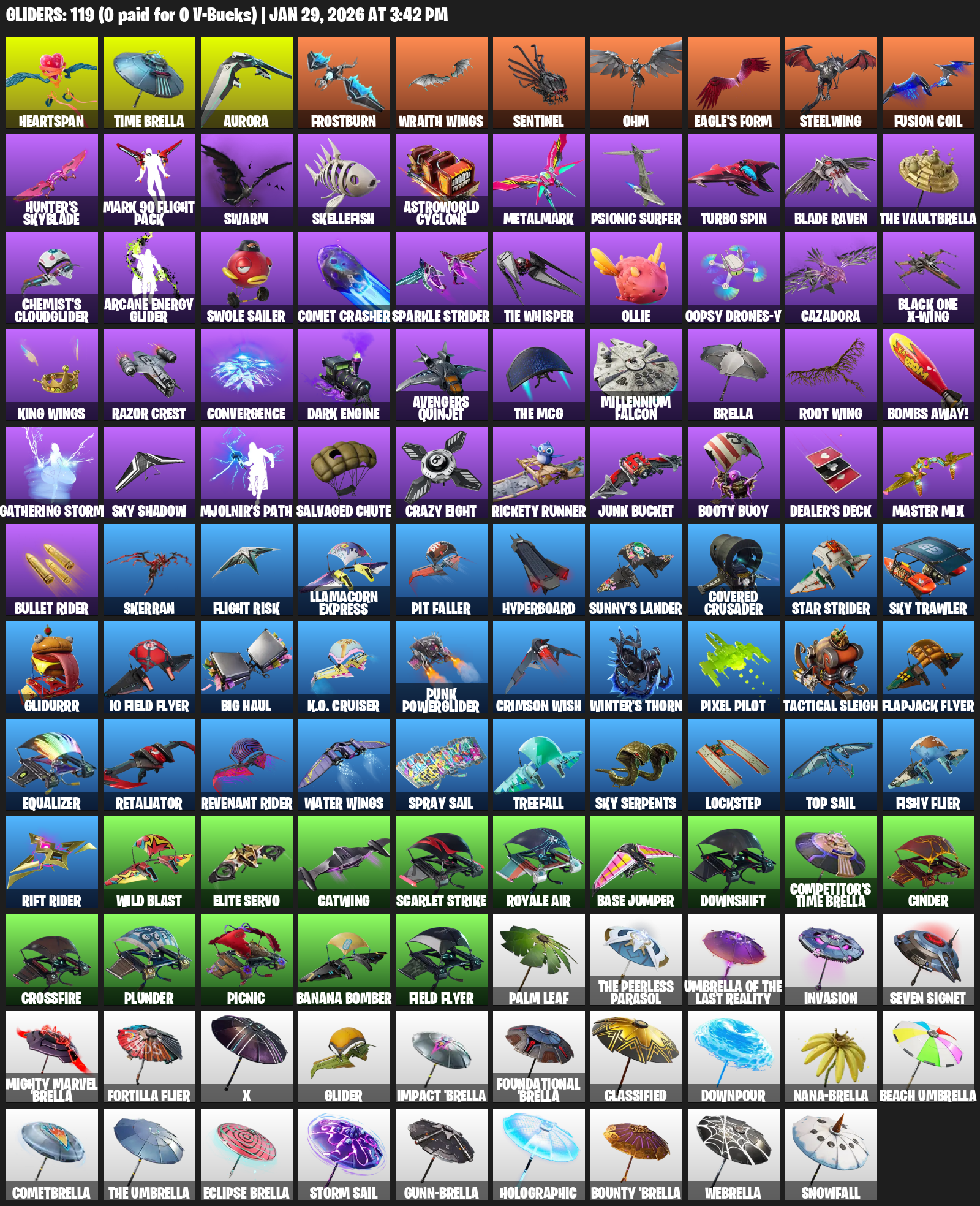 Heartspan, Time Brella, Aurora, Frostburn, Wraith Wings, Ohm, Eagle’s Form, Steelwing, Hunter’s Skyblade, Swarm, Skellefish, Astroworld Cyclone, Metalmark, Psionic Surfer, Turbo Spin