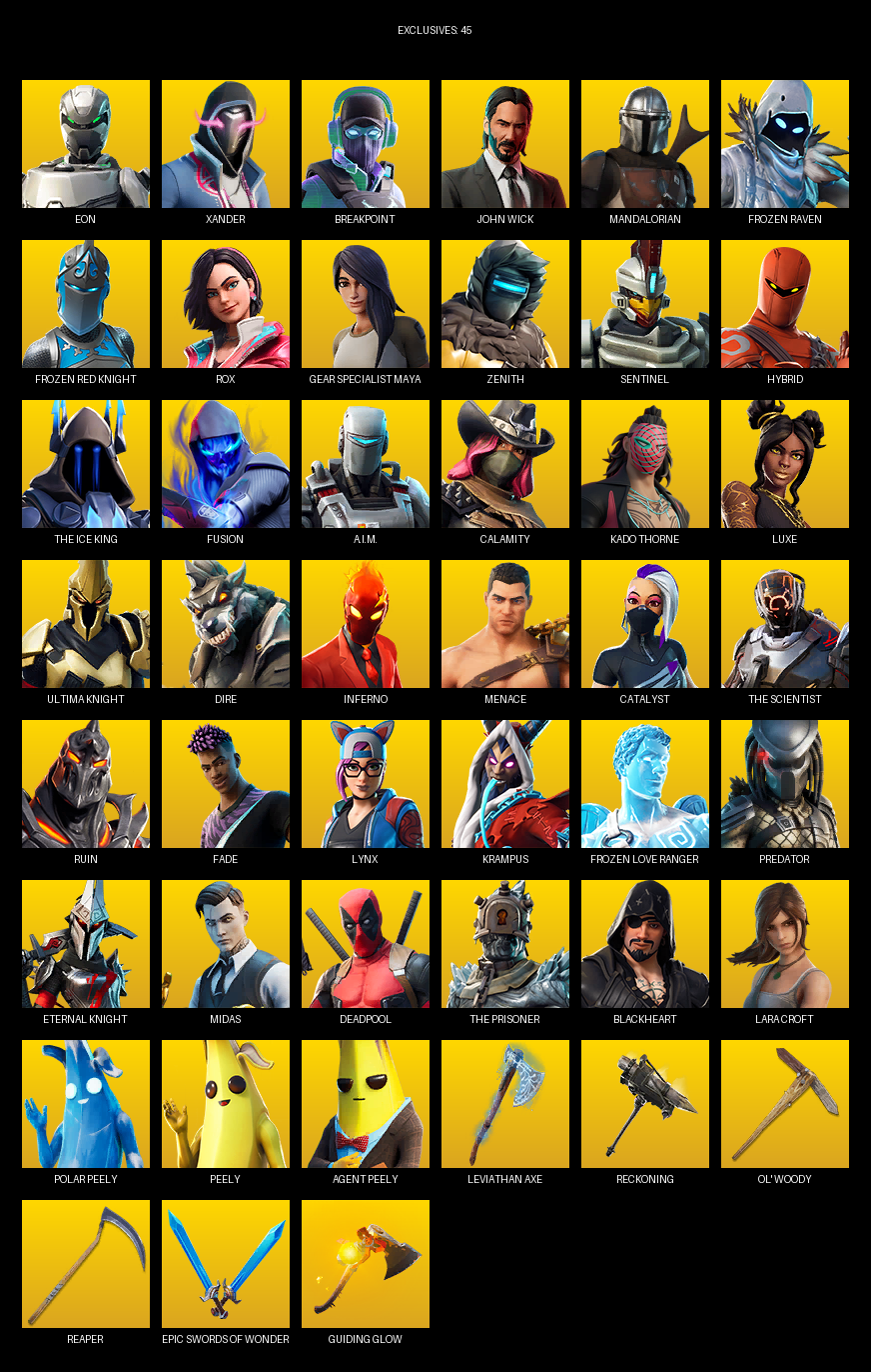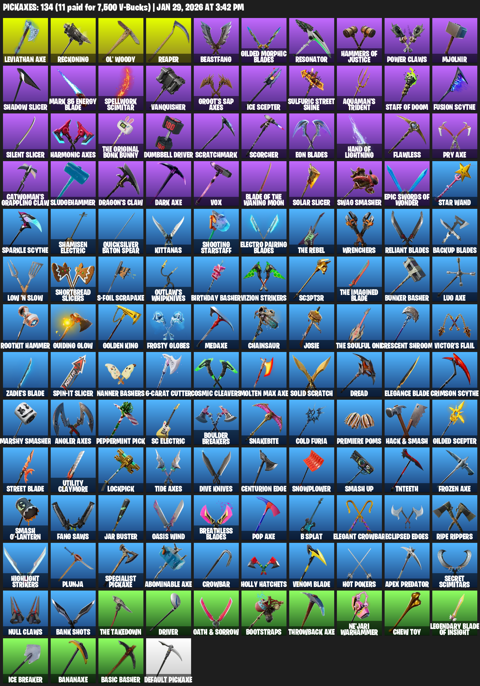 Leviathan Axe, Reckoning, Ol’ Woody, Reaper, Beastfang, Gilded Morphic Blades, Resonator, Hammers of Justice, Power Claws, Mjolnir, Shadow Slicer, Mark 85 Energy Blade, Spellwork Scimitar, Vanquisher, Groot’s Sap Axes, Sulfuric Street Shine, Aquaman’s Trident