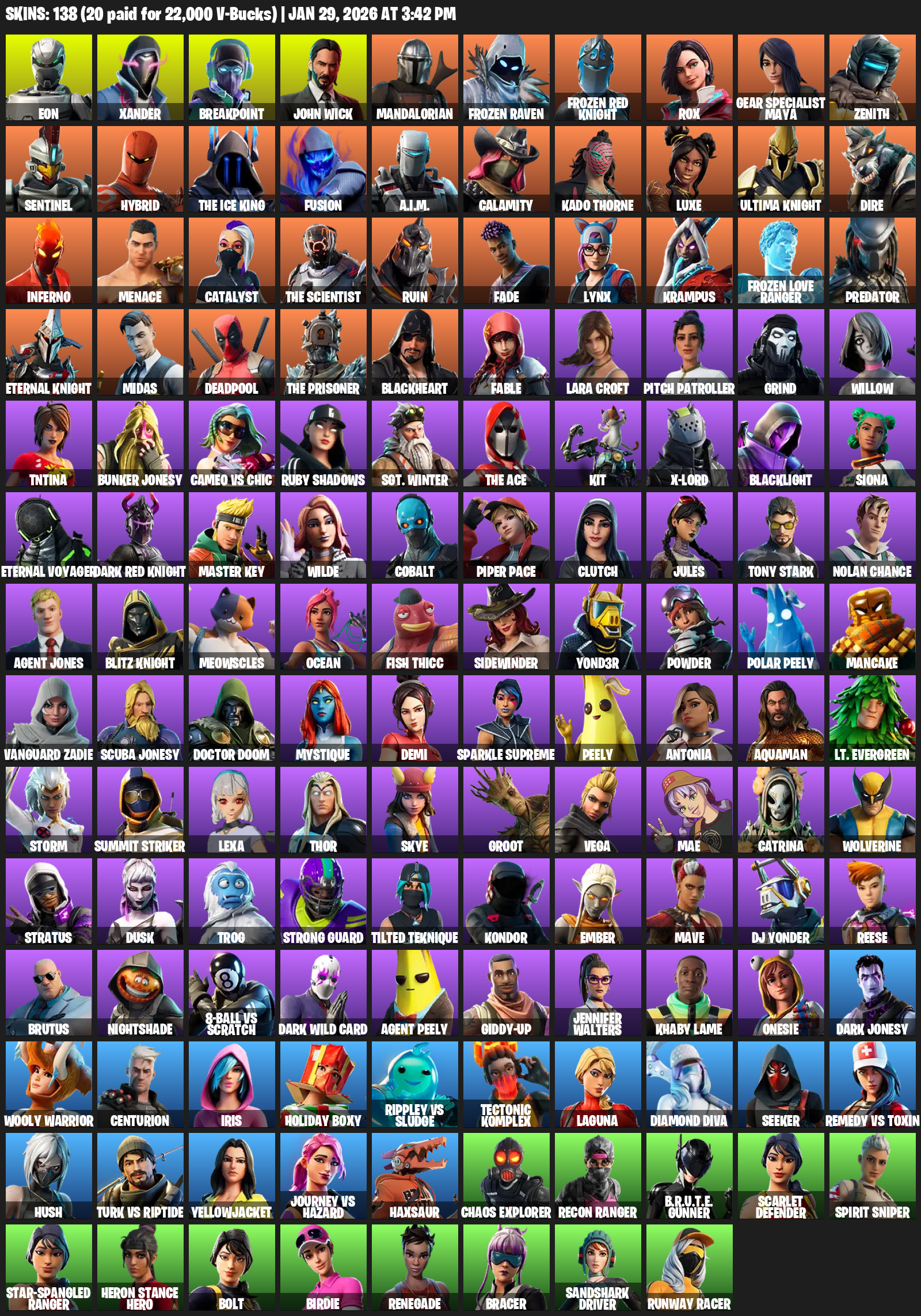 Gear Specialist Maya, Lara Croft, Eon, Xander, Breakpoint, John Wick, Mandalorian, Frozen Raven, Rox, Zenith, Sentinel, Hybrid, The Ice King, Fusion, A.I.M., Calamity, Kado Thorne, Luxe, Ultima Knight