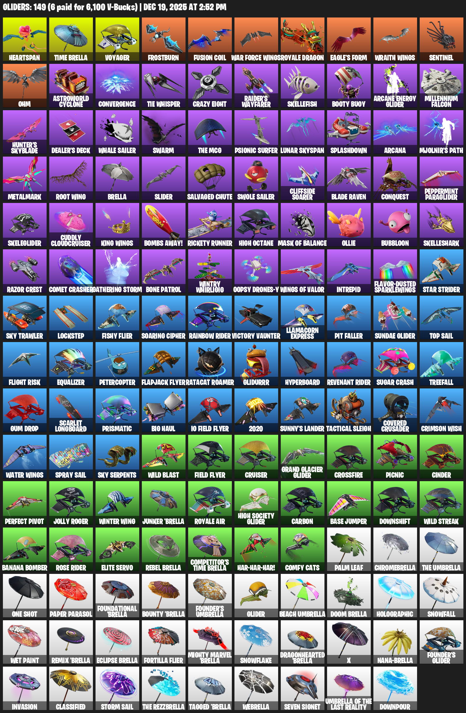 Heartspan, Time Brella, Voyager, Frostburn, War Force Wings, Royale Dragon, Eagle’s Form, Sentinel, Ohm, Astroworld Cyclone, Convergence, TIE Whisper, Crazy Eight, Raider’s Wayfarer, Skellefish, Booty Buoy, Arcane Energy Glider, Millennium Falcon